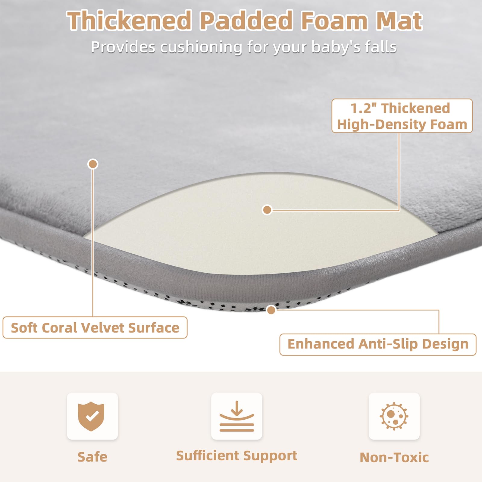 Thick Padded Foam Play Mat:The mat features a 1.2-inch thick memory foam core and ultra-soft flannel fabric surface.It's perfect for a 47x47 baby playpen,offering both support and plush comfort,providing a soft and sturdy surface for babies and toddlers to explore and play without worries of bumps or falls.
