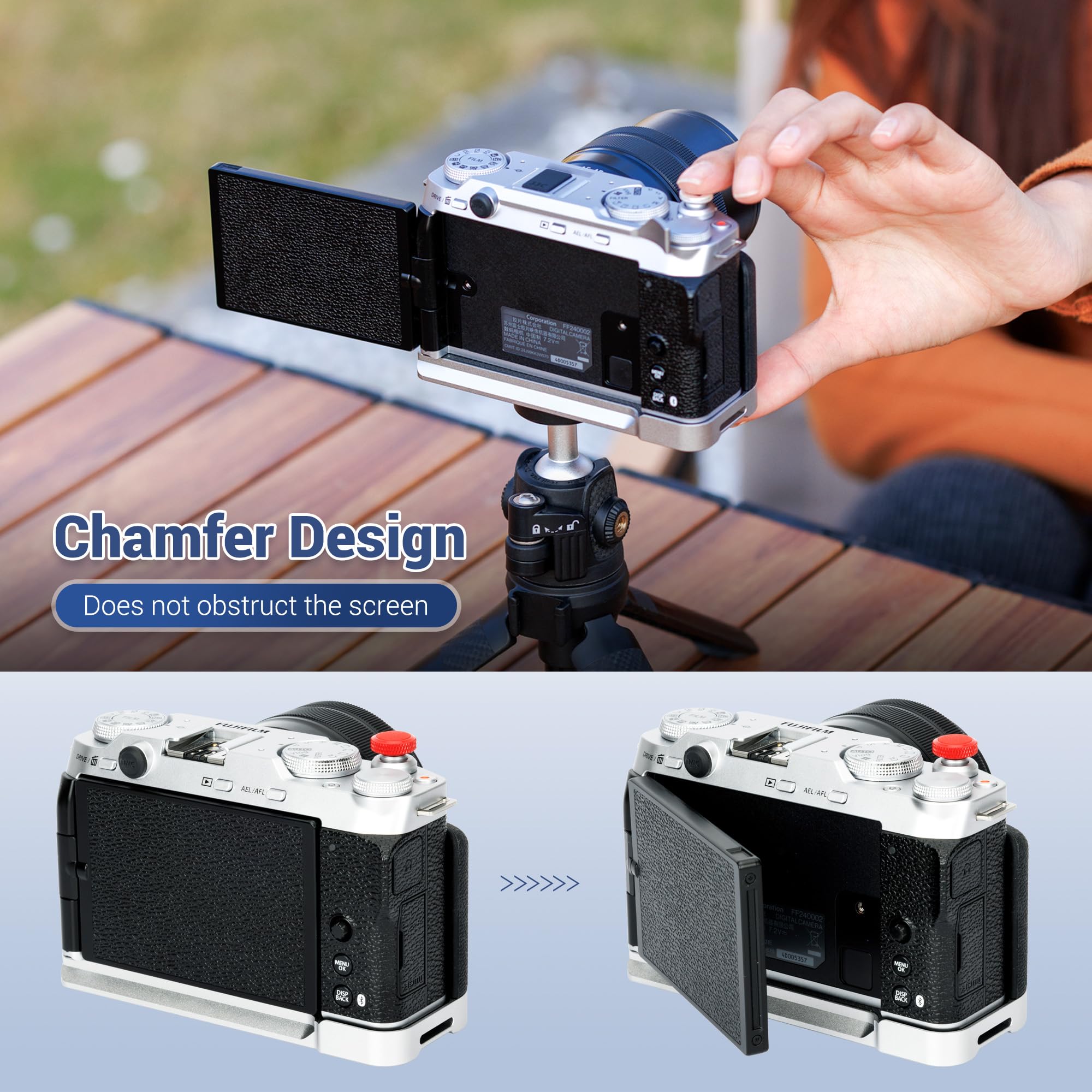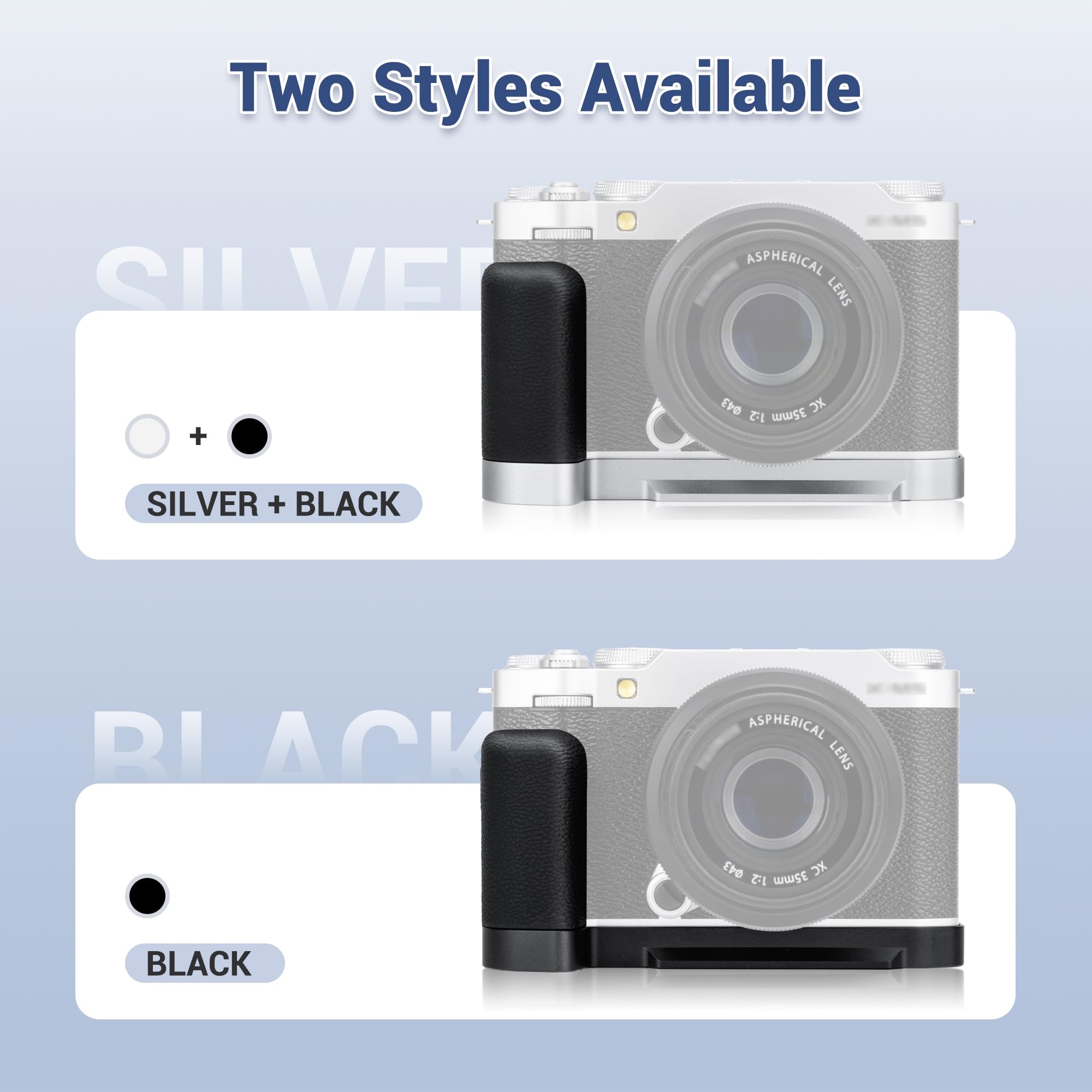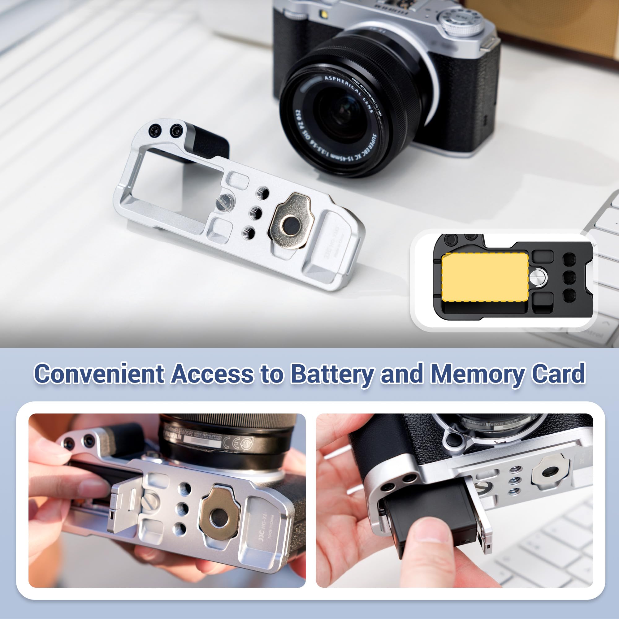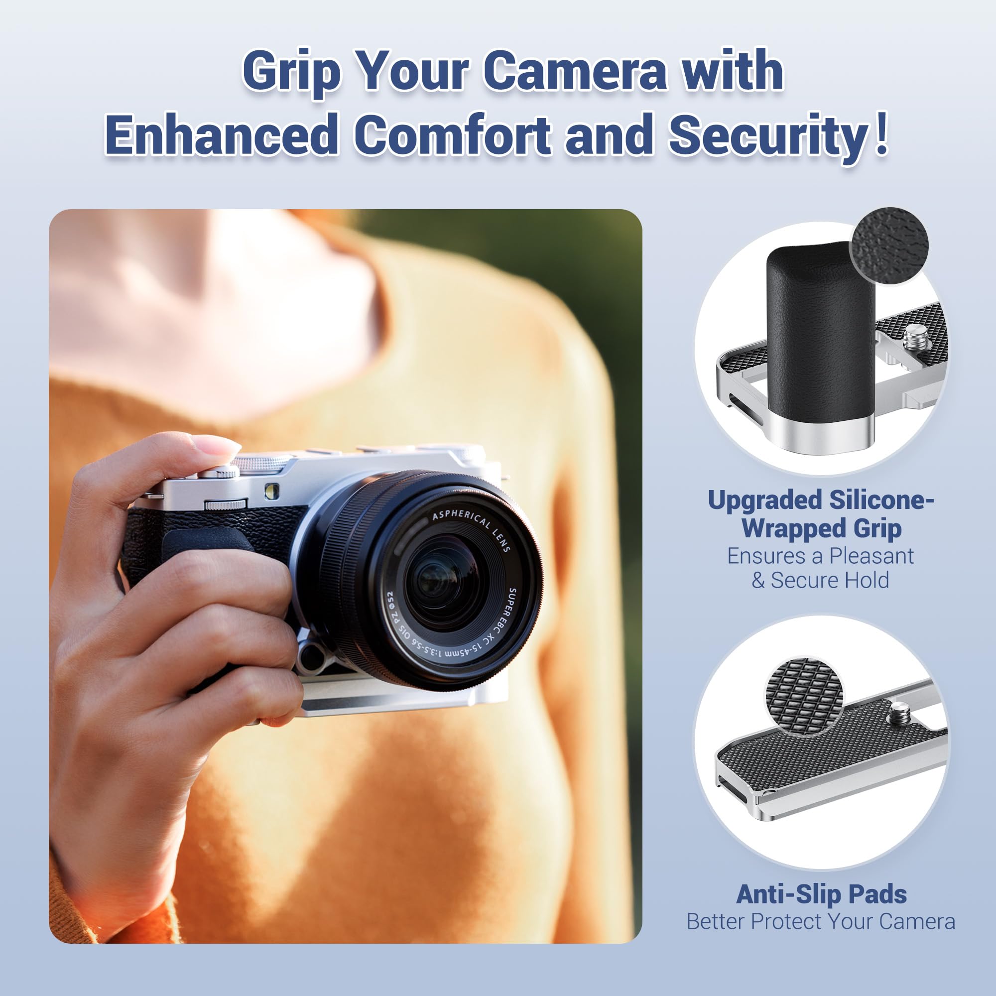 Made of aluminium alloy, it is sturdy and durable. The microfibre leather on the surface of the grip is non-slip and comfortable. There is also a silicone pad at the bottom of the handle, which can not only prevent scratches on the camera, it also increase friction to reduce the risk of camera dropping, providing a stable and secure XM5 handgrip.