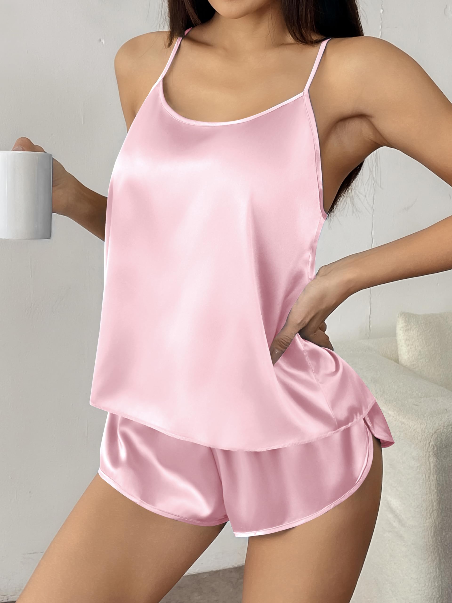2-PIECE CAMI & SHORTS: Cute, flirty sexy satin pajamas for women—playful gothic/cute prints & solid hues; adjustable cross-back cami & side-slit shorts. Ideal for gothic gatherings/sleepovers/Halloween/bachelorette parties