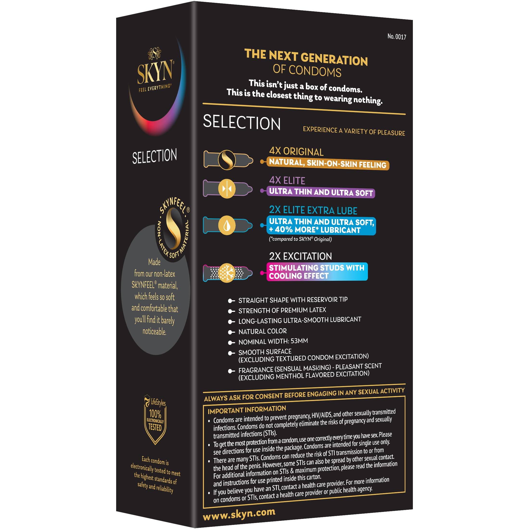 Variety of sensations: SKYN Selection Variety pack features 4 types of assorted lubricated non-latex condoms including 4 Original, 2 Excitation, 4 Elite, and 2 Elite Extra Lube; these condoms have a sensual masking fragrance