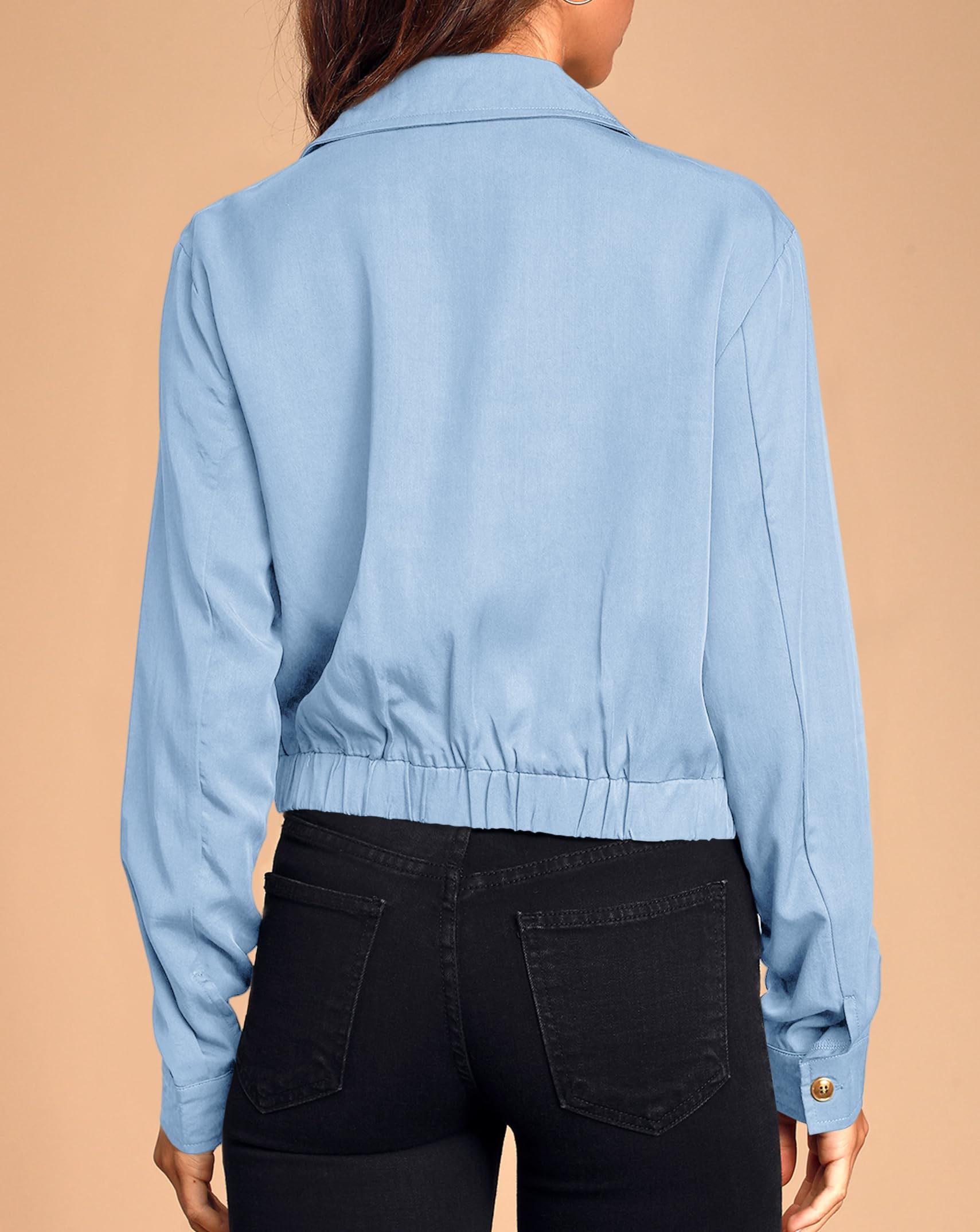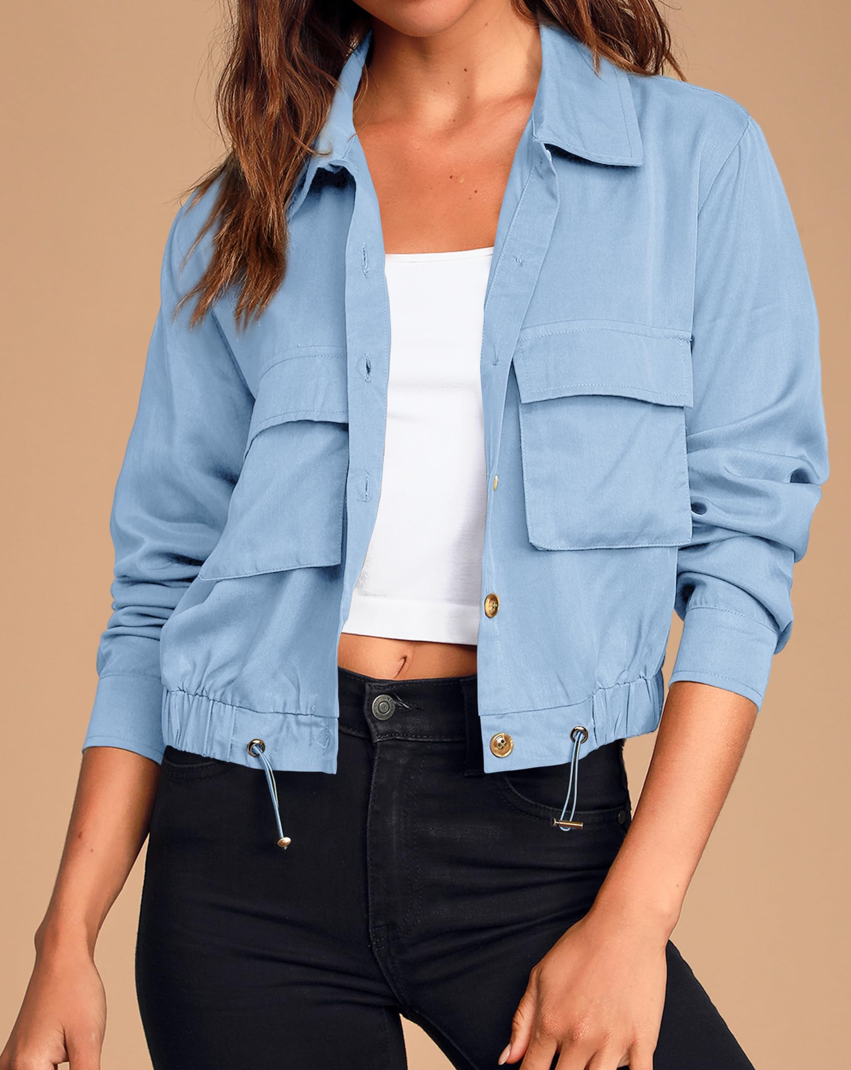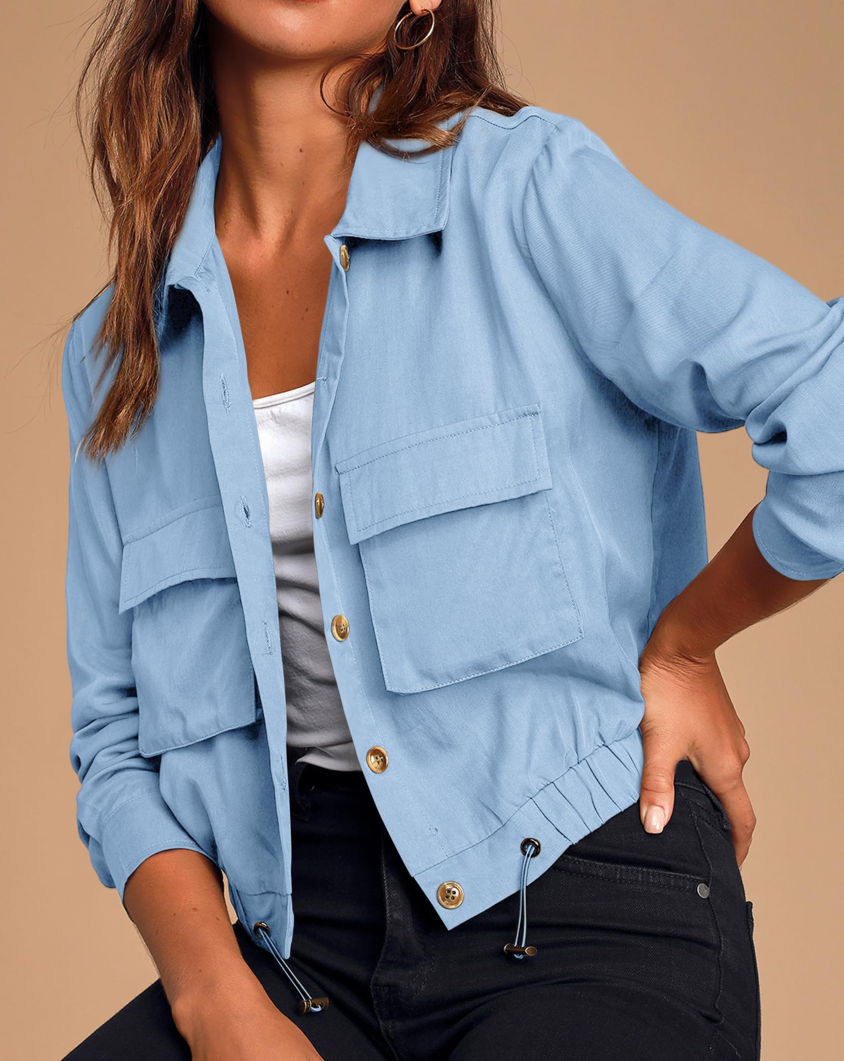 Feature: Lightweight, Button down light jacket women, long sleeve, single breasted, basic solid color, button cuffs, 2 chest pockets, short length, casual cropped style, adjustable drawstring, casual relaxed fit.