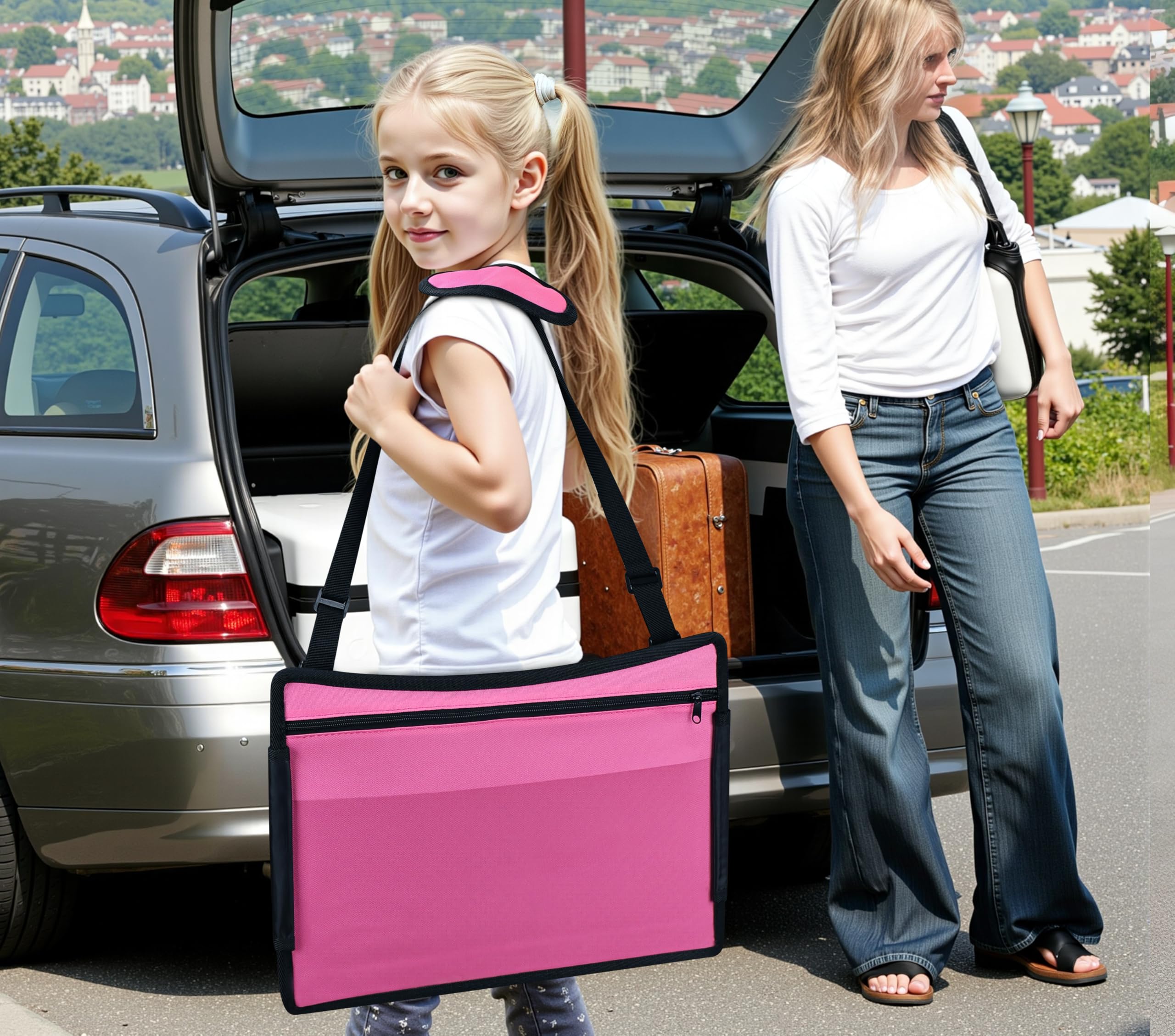 Car Seat Table Size : Our 17" x 13.5" x 1.5" kids travel tray for car seat is compatible with most kids car seats and airplane seats. The adjustable shoulder strap and foldable design make car seat tray easy to store, while the car seat tray even doubles as a compact backpack for added portability. Perfect for use cars, airplanes, trains, camping, parks and more. The toddler travel tray for car seat can be the birthday gifts and Christmas gifts for your kids