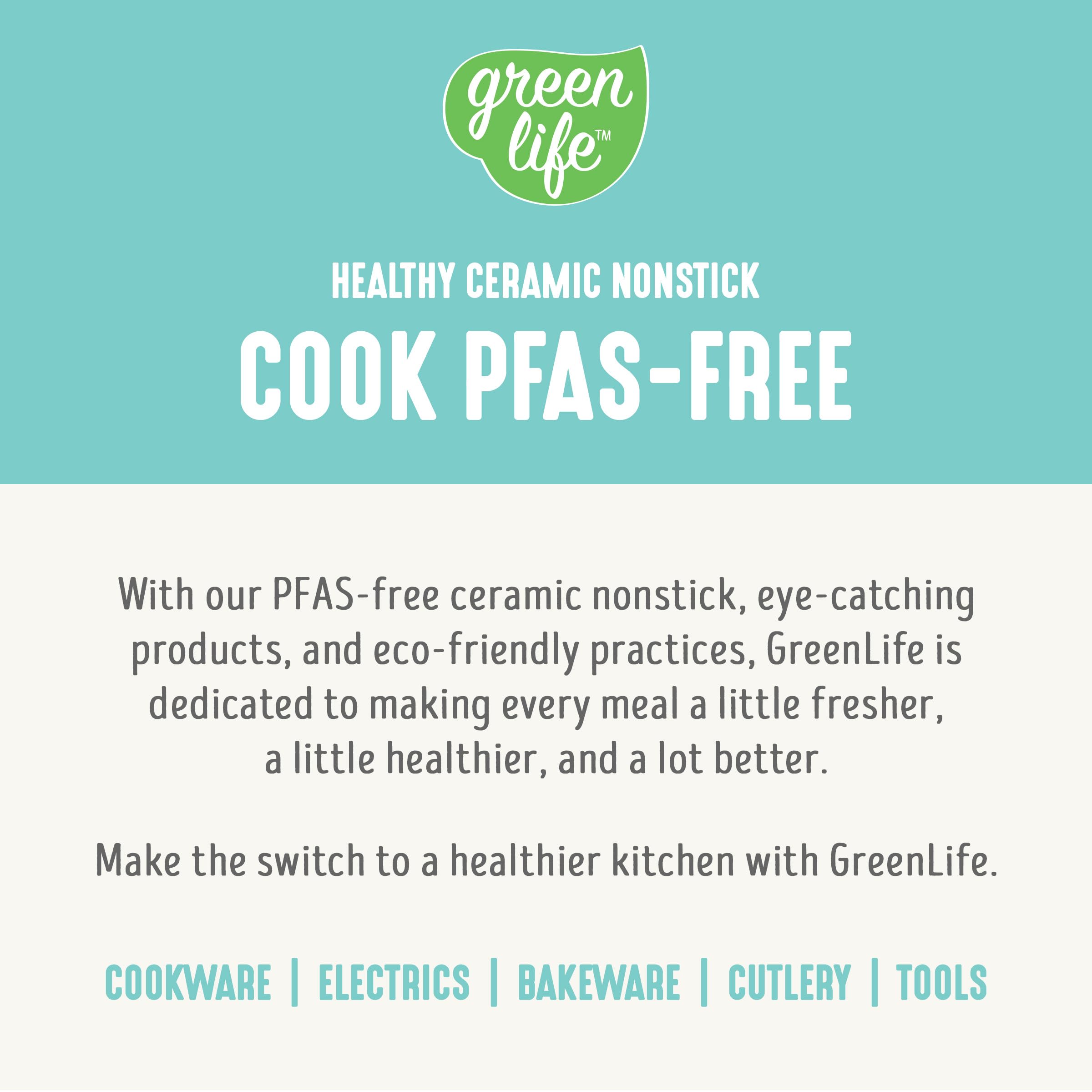 The Soft Grip collection is all about comfort and control. Designed for effortless performance and cleanup, this set features our toxin-free Thermolon nonstick coating, which is free of PFAS, PFOA, lead, and cadmium. GreenLife’s healthy ceramic nonstick is not stuck in the past—that’s why our ceramic nonstick starts with sand and creates 60% less CO2 emissions during the curing phase than traditional coatings. The pans are also crafted with recycled materials, because we want your kids’s kids to cook healthy, too. Finished in vibrant colors, this set is outfitted with stay-cool handles to keep your cooking comfortable. Durable glass lids for a good look at any meal in progress without sacrificing heat. For all stovetops, except induction. Oven safe to 350°F. Dishwasher safe. This cookware set includes: 4-inch mini frypan, 7-inch and 9.5-inch open frypans, 1-quart and 2-quart covered sauce pans, 5-quart covered stockpot, 2.5-quart covered sauté pan, stainless steel steamer, and 4 kitchen utensils.