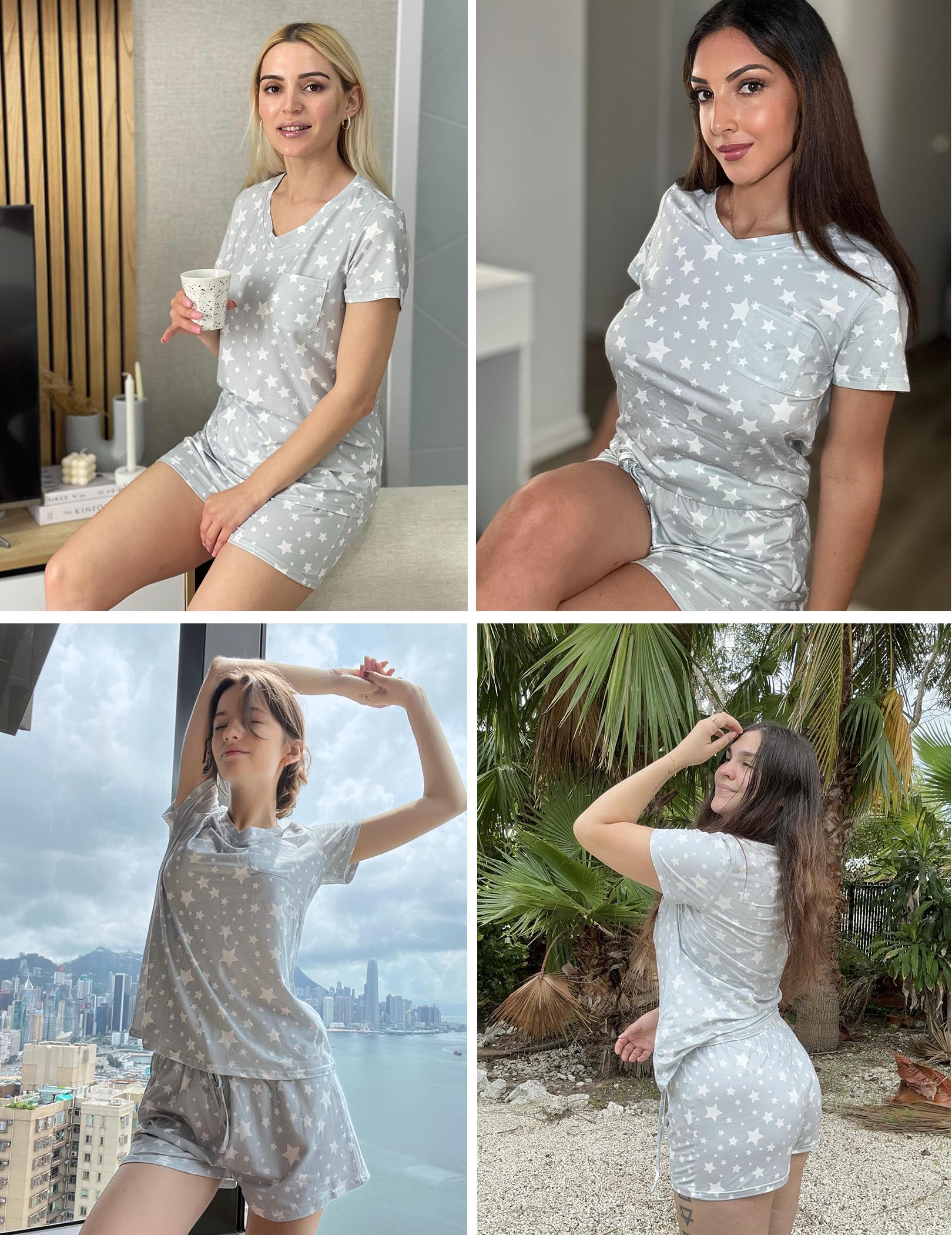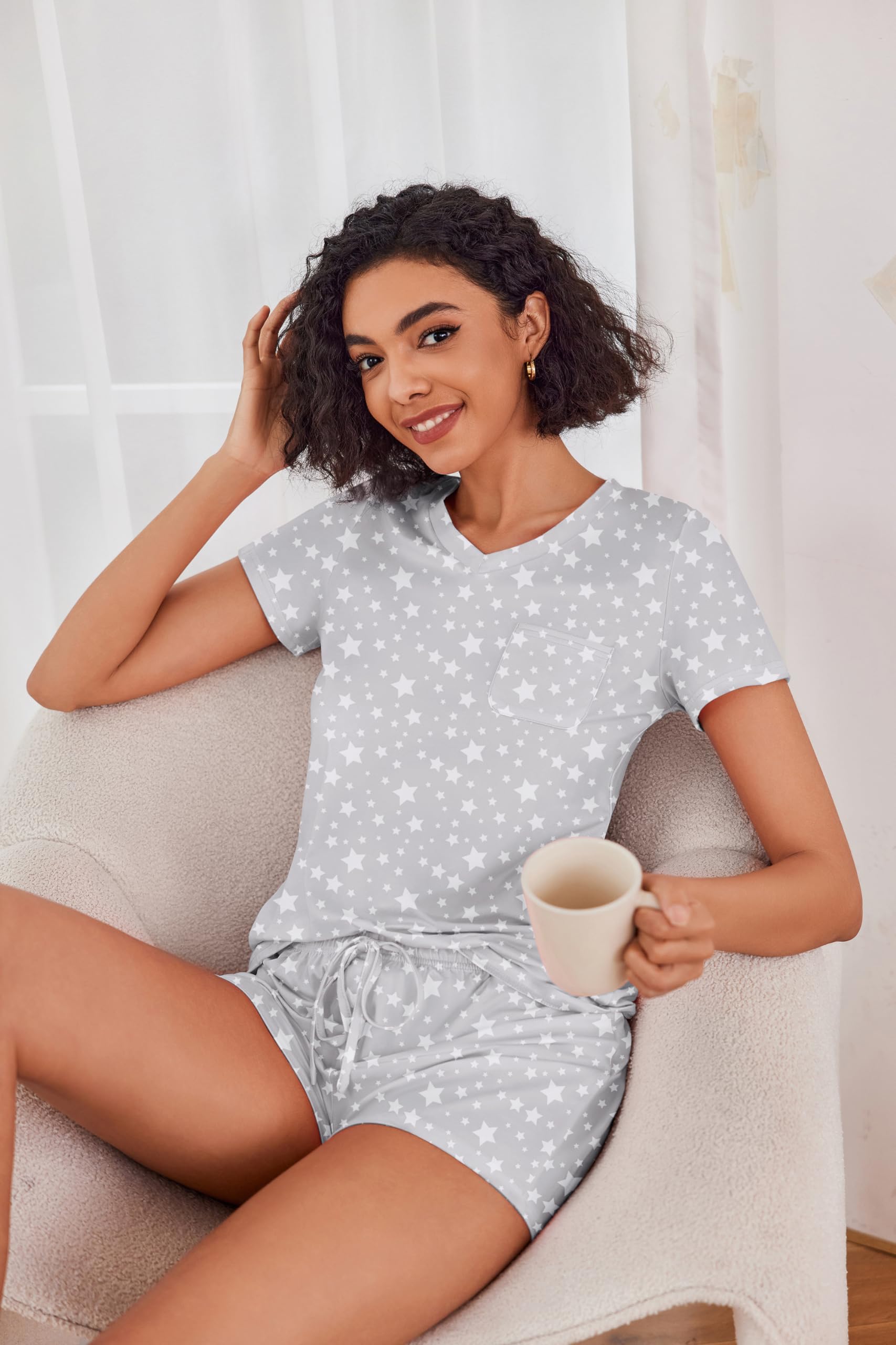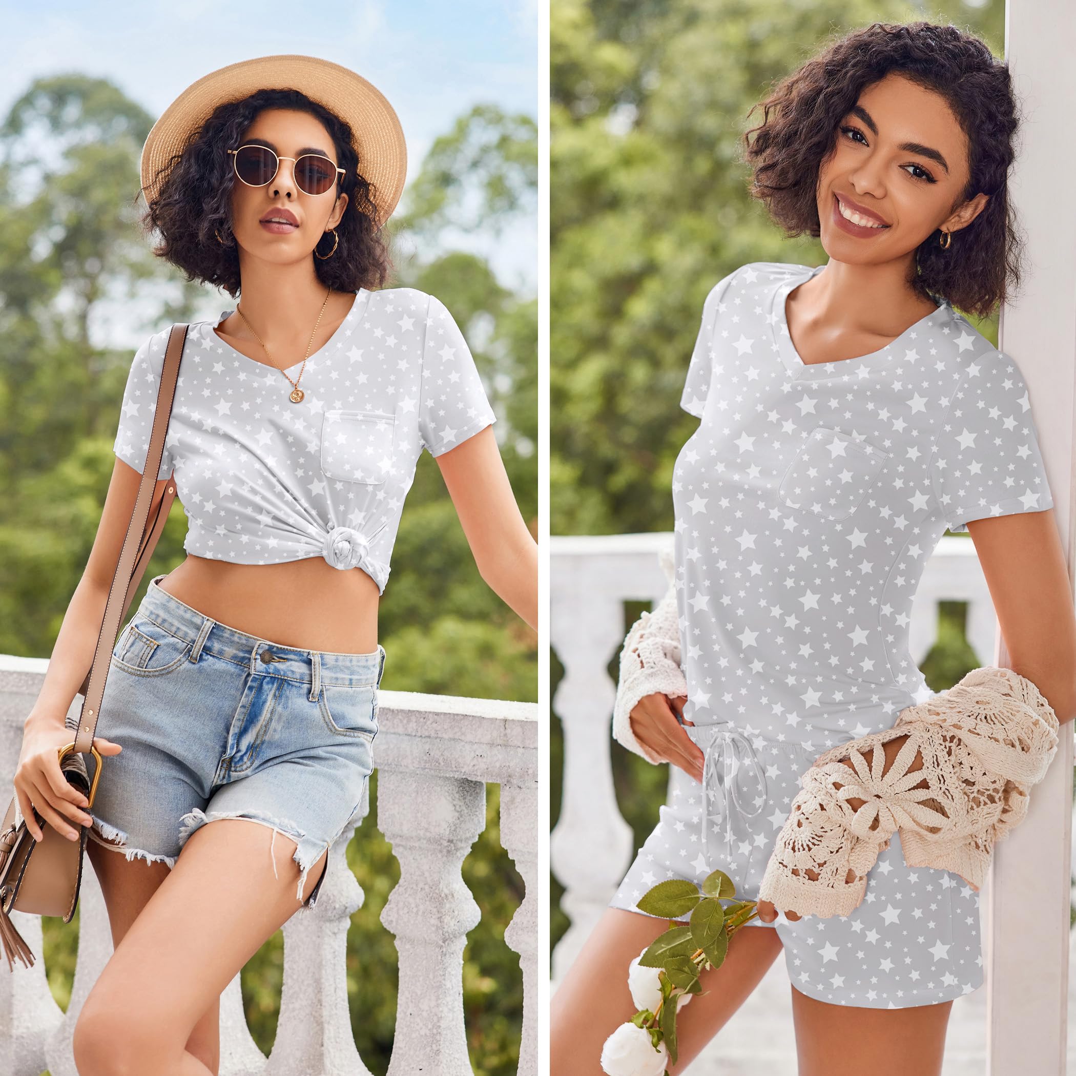 FEATURES: pajama sets for women 2 piece, pj sets for woman, V neck women's pajama sets, short sleeve T-shirt, drawstring elastic waist shorts.