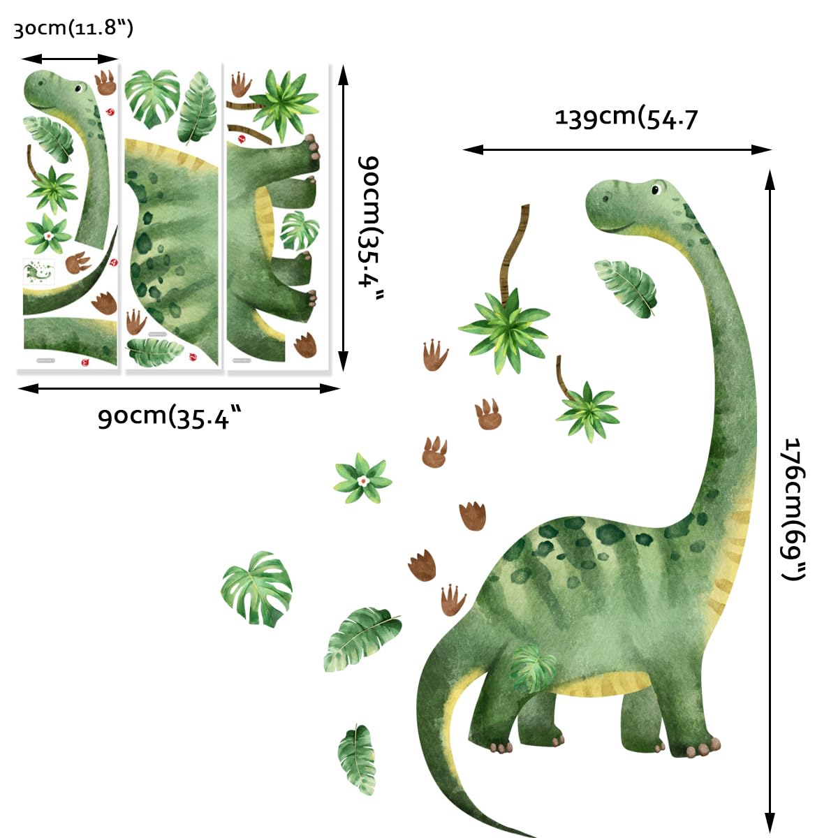 Giant dinosaur wall decal with tropical palm leaves, dinosaur footprints and more, dimensions (including leaf) are approximately 69 inches (H), 54 inches (W) / 176 cm (H), 139 cm (W).