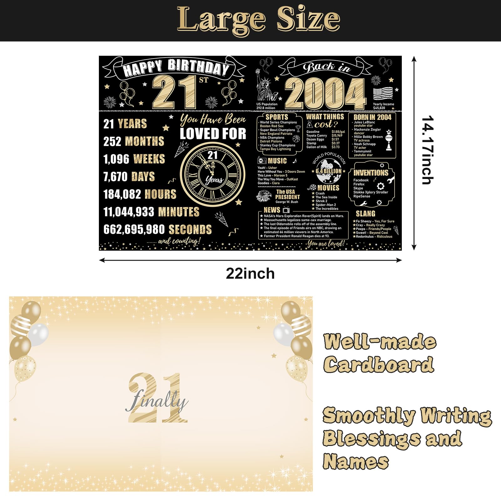 【Vintage 2004 21st birthday themed design】The double-sided design incorporates black and gold tones, featuring birthday elements like balloons and fireworks, commemorating significant events from 2004. It is both interesting and meaningful