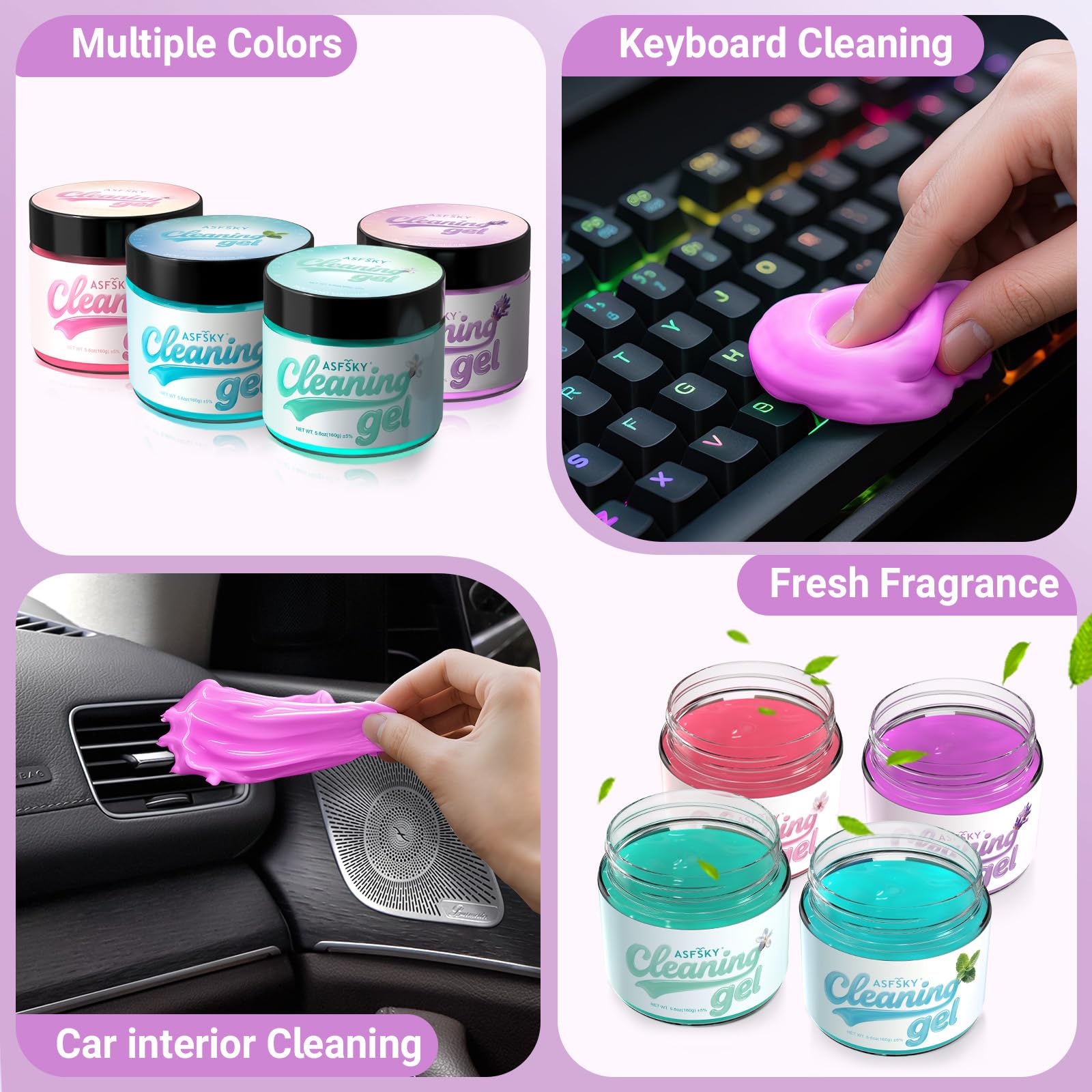 EFFECTIVE CLEANING WITH STRONG CLEANING POWER.Tired of dust and debris lingering in those hard - to - reach corners?Our brand - new 160g aromatherapy - scented cleaning gel is here to save the day!This gel is soft and incredibly effective, grabs hold of dust and garbage in air vents, office keyboards, and home blinds' gaps,also for home and office use, cleaning putty for electronics, computer keyboard, laptops, cell phone, calculator, TV remote and furniture.