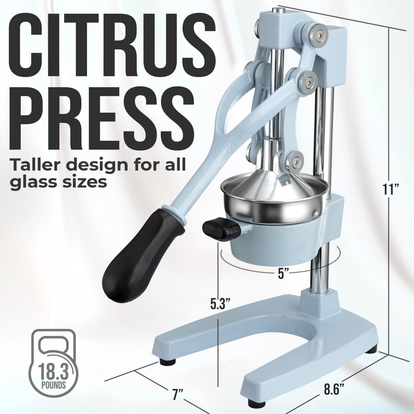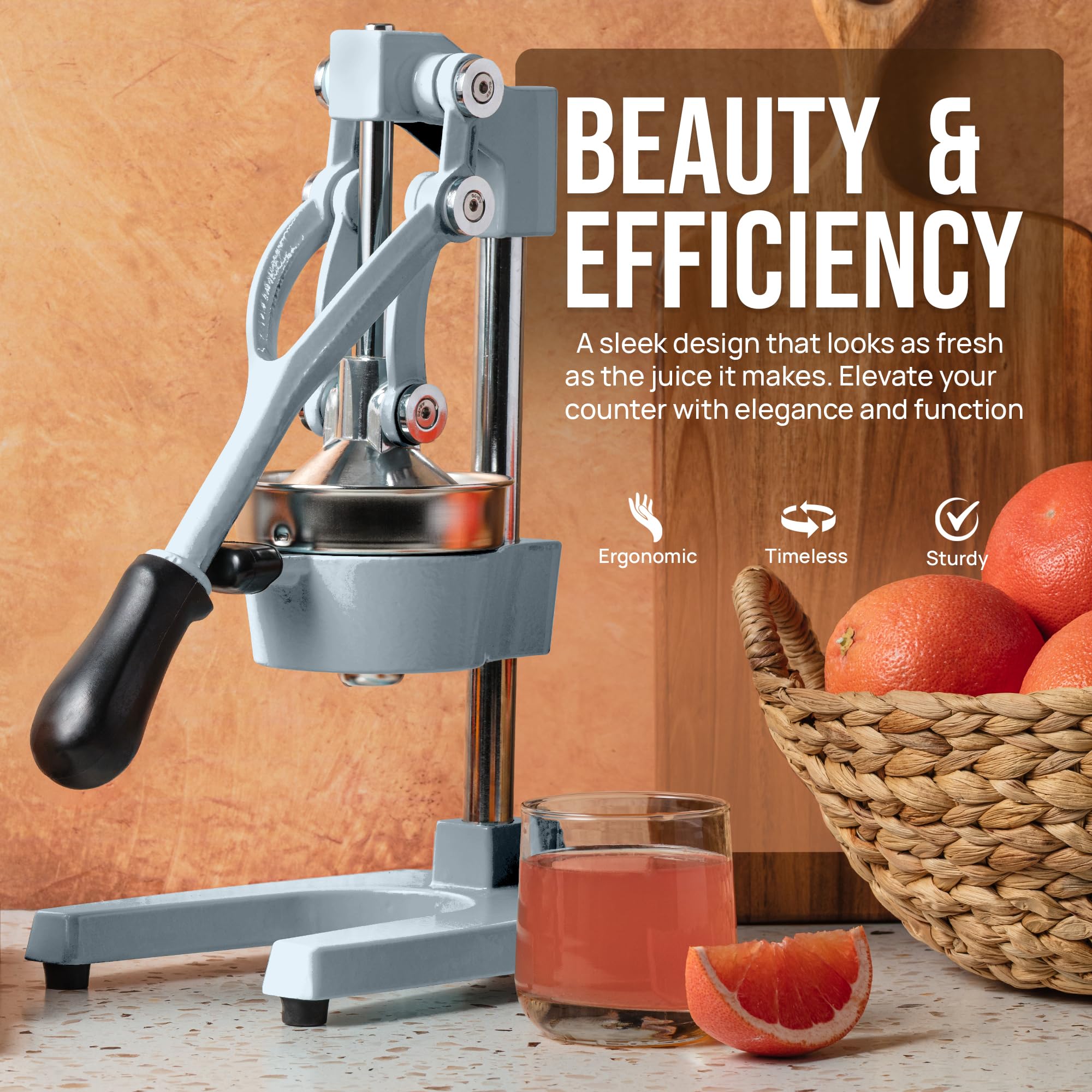 STURDY AND DURABLE MATERIAL: This manual juicer is made of heavy-duty cast iron that can easily withstand the pressure from continuous pressing for years to come. The leverage mechanism allows a one-time easy pull to get all the juice out. Our citrus press is designed with a heavy rubberized base to firmly keep it in place without the fear of falling tipping or sliding off the counter. This hand juicer is great for both professional and at-home use