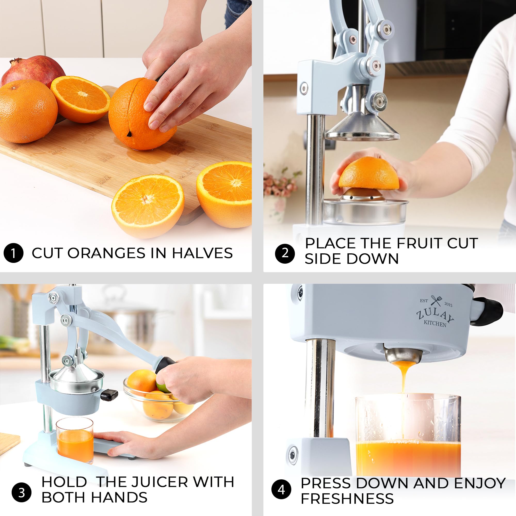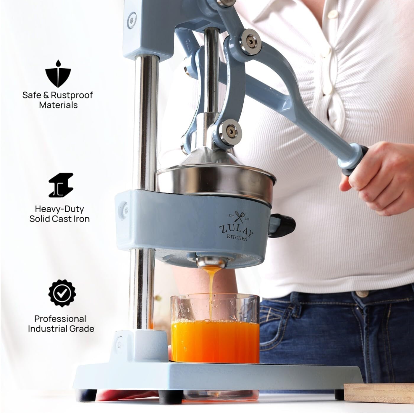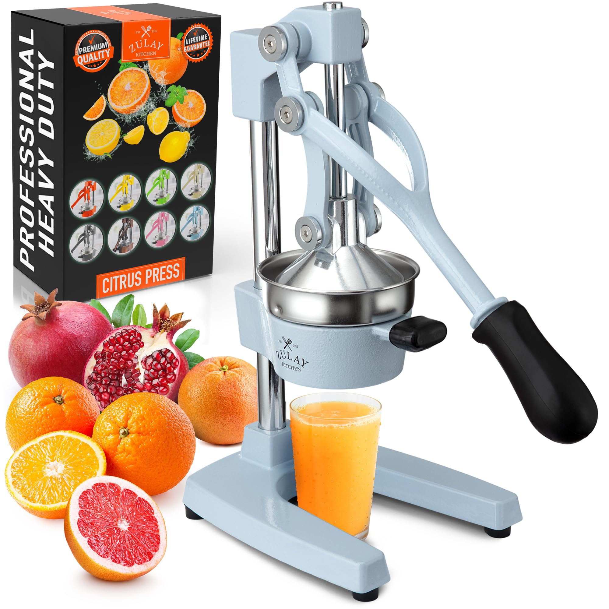 About this item SQUEEZE OUT EVERY DROP OF JUICE:Our lemon squeezer won’t waste even a single drop from your favorite fruit and will also leave the seeds and pulp behind! The 5-inch diameter of the citrus press bowl makes it suitable for various types and sizes of fruit. Watch the juicy goodness of limes, lemons, oranges, grapefruit, apples, pineapples, pomegranates, and other citrus fruits come straight out of the citrus squeezer, ready to add flavor to your meals or drinks. SAVE TIME AND EFFORT:Our citrus juicer makes juicing easy-peasy lemon squeezy. The comfortable grip handle allows you to squeeze all the juice from lemons, limes, or oranges in seconds for making delicious recipes like guacamole, lemonade, cocktails, and more. Unlike bulky electric juicers, you no longer have to worry about electricity or replacing batteries with this manual citrus press. STURDY AND DURABLE MATERIAL:This manual juicer is made of heavy-duty cast iron that can easily withstand the pressure from continuous pressing for years to come. The leverage mechanism allows a one-time easy pull to get all the juice out. Our citrus press is designed with a heavy rubberized base to firmly keep it in place without the fear of falling, tipping, or sliding off the counter. This hand juicer is great for both professional and at-home use. EASY TO CLEAN AND SAFE TO USE:Focus more on extracting fresh fruit juice than worrying about cleaning up. All parts of this juice press are detachable and dishwasher friendly, which makes cleaning super quick. The stainless steel bowl and filter cone are made using material, making the fruit squeezer safe and healthy to use. HASSLE-FREE, ZULAY GUARANTEE:We love and take our pomegranate juicer and back it up with a lifetime guarantee. Have the confidence that this product will last. If there are ever any issues, just contact us and we will make it right.