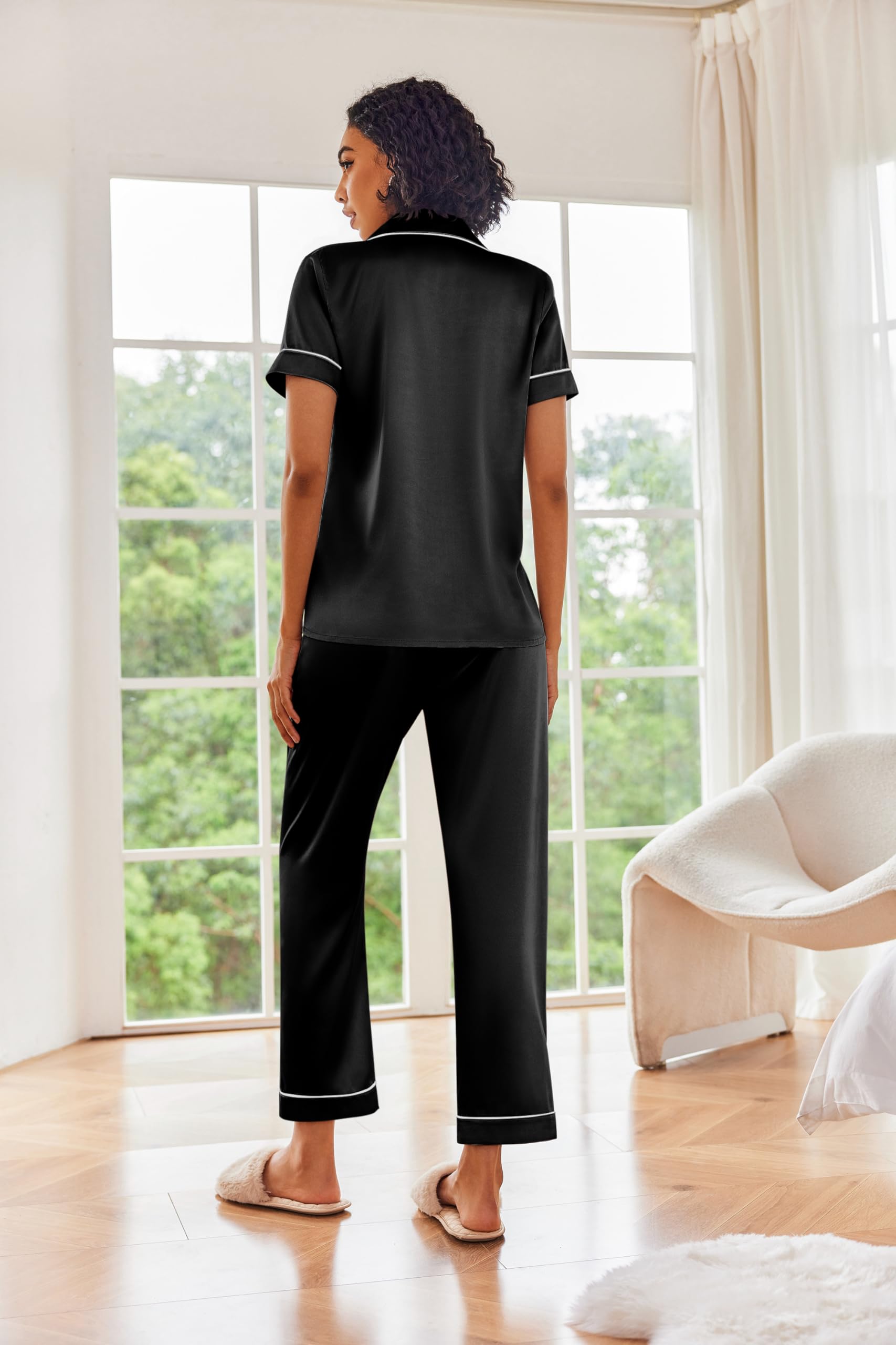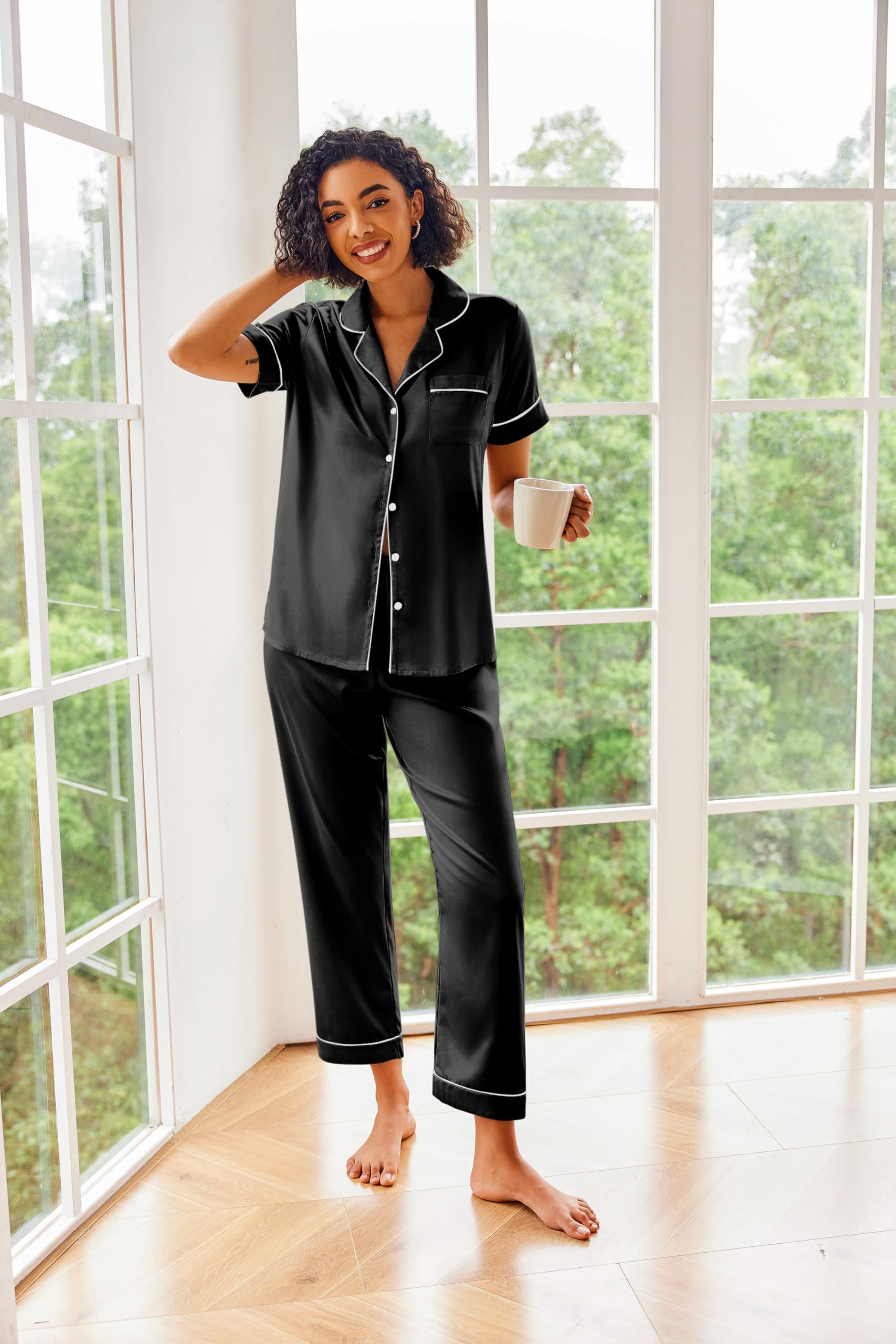 Classic Button Down Pajamas: The relaxed fit two piece comfortable loungewear features the silk bottoms with elastic waist and matches a silky-smooth short-sleeve V-neck top with a chest pocket. Suitable for all seasons. Classic full button up pj set is easy to put on and take off.