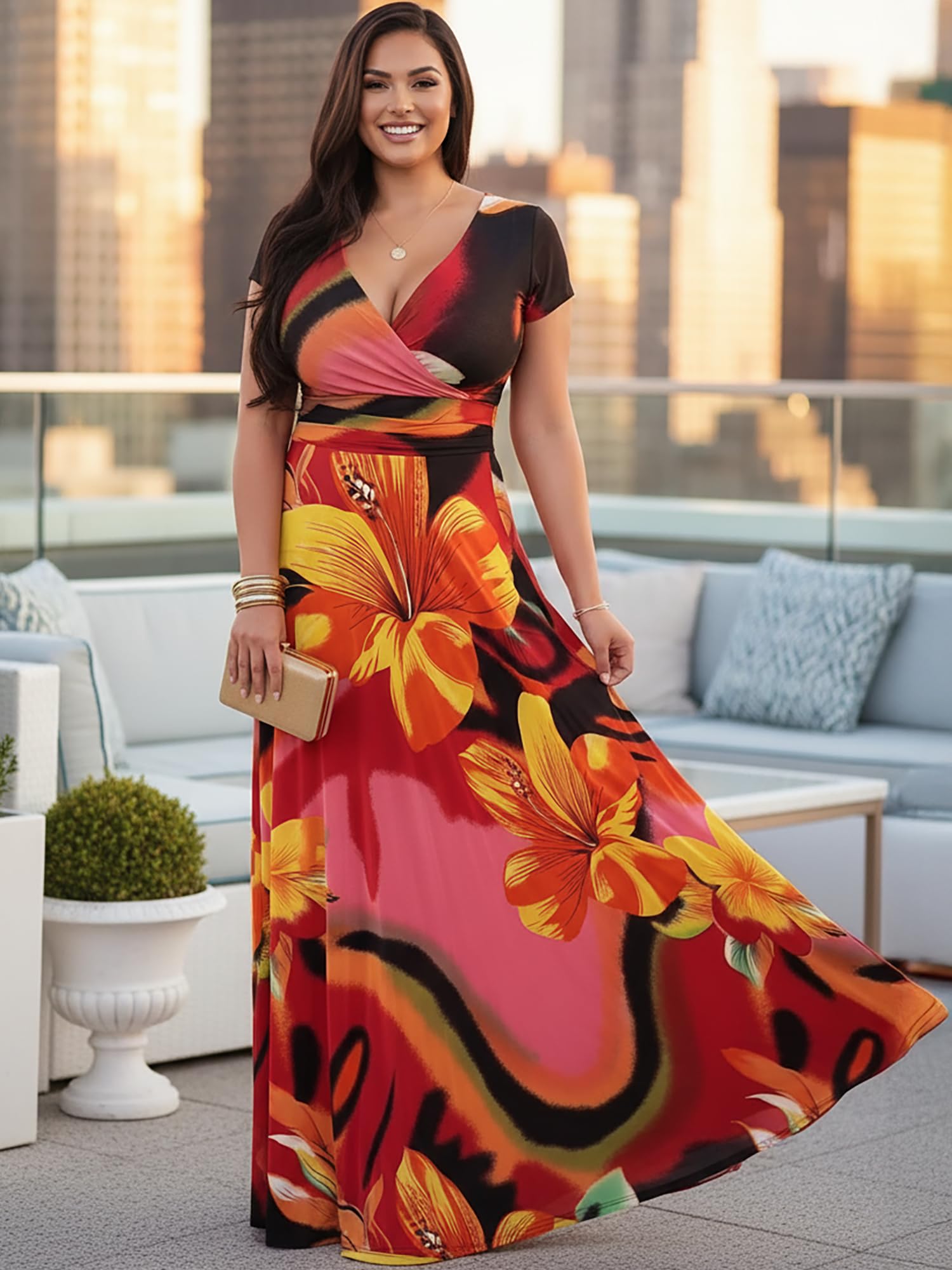 Chic stylish Pink Red Yellow daily wear; vivid bright flower color pattern; stretchy elastic empire waist attire; front wrap V-neck; cap sleeve sundress frock; Sunday church barbecue bbq outfit; gorgeous dress with sleeves; A-line maxi for women