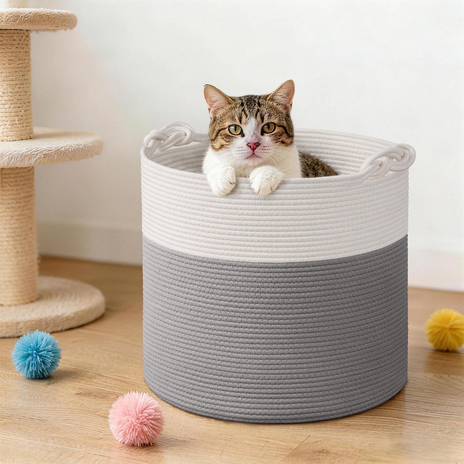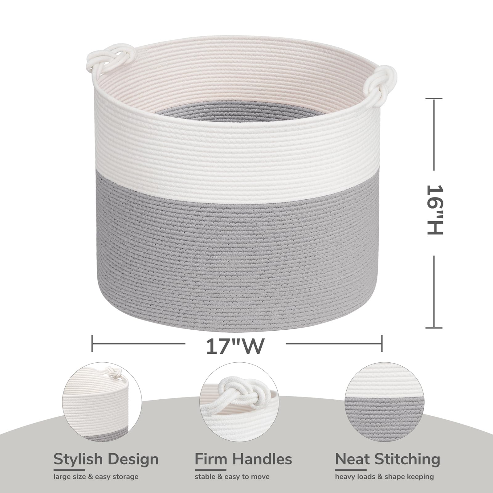 Woven Storage Basket for Living room -Color: Grey -Size: 17""L x 17""W x 16""H -Capacity: 60L -Material: cotton rope, made by hands, no hazard contents for human body and organisms, without any chemicals, more sturdy to satisfy your daily need. -Washable:Hand Wash. Please use soft wet towel or brush to clean, do not use rough or hard toll to clean the product. -Home Decor: The two-tone rope storage basket is great for nursery or playroom storage, but also stylish enough for your family room or bedroom. Whether it is holding toys, blankets or even clothes, this basket is the perfect fit. For any room, shelves, vanities and so much more... Whether you’re looking to organize a room, shelf space, or vanities, the cotton rope storage will have your friends and family commenting on how beautiful your space looks. It can be used as a towel basket, or laundry basket, this strong constructed basket will hold up to all of your needs. -Baby and Kids: Fashion design in natural cotton material, close touch with skin, good softness, no scratch to kid's skin and also the woody floor. Nursery organization is a priority, but don’t let your space get out of control. Use this basket to store diapers, toys or anything else you want out of sight, but within reach! -Large Uses: our cotton storage container can hold toys, games, art craft supplies, clothes and more. Keep in the kid room, family room, or any room in the house that could use extra storage: fits on a closet shelf, bookshelf or desk.
