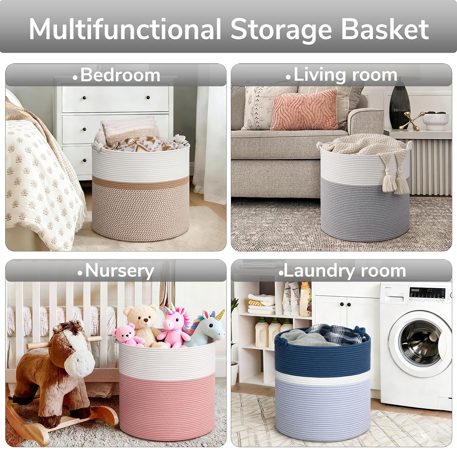 Nursery Storage Basket. This toy storage basket has a large size of 17 inches x 16 inches, which can store more toys for nursery and playroom. Meanwhile, this cotton rope basket can also be used to store household blankets, pillows, clothes, daily necessities in the living room. A multifunctional basket that helps keep your home tidy and solves storage issues.