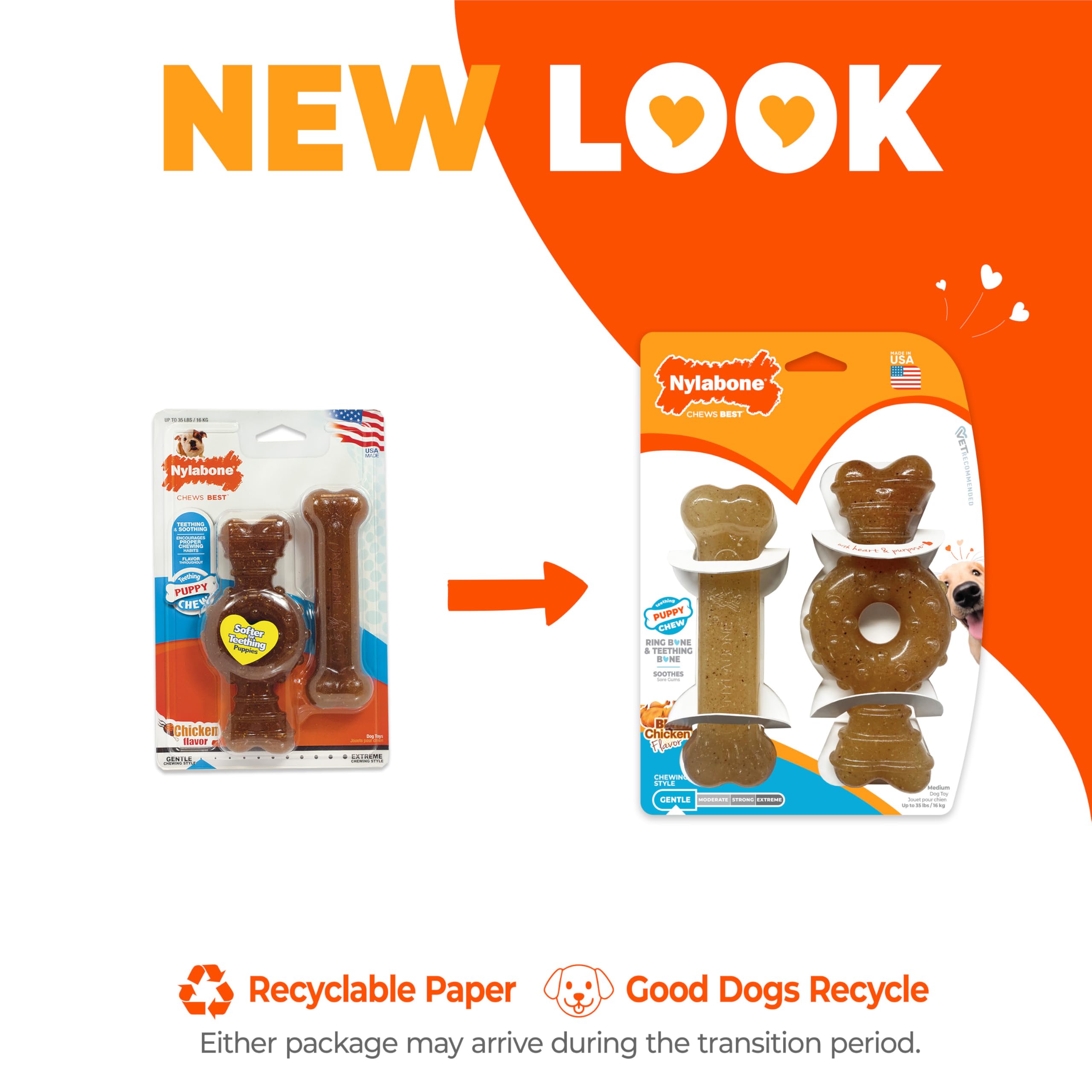 Treat your new family member to this perfect combination of puppy toys! This value pack includes two long lasting chew toys designed to encourage positive chewing habits. The first puppy toy is made of softer, flexible material made just for teething puppies! The second is a durable nylon bone for your puppy to chew when he has all of his adult teeth. Both toys help promote clean teeth and discourage destructive chewing. These chew toys are the perfect pastime for your teething puppy! Color may vary. What your dog chews matters! With destructive behavior among the leading reasons dogs are returned to shelters, we know healthy habits can make a life-changing difference. For 70 years, our family-founded brand continues to safely satisfy dogs’ chewing instincts and help them stay in loving forever homes!