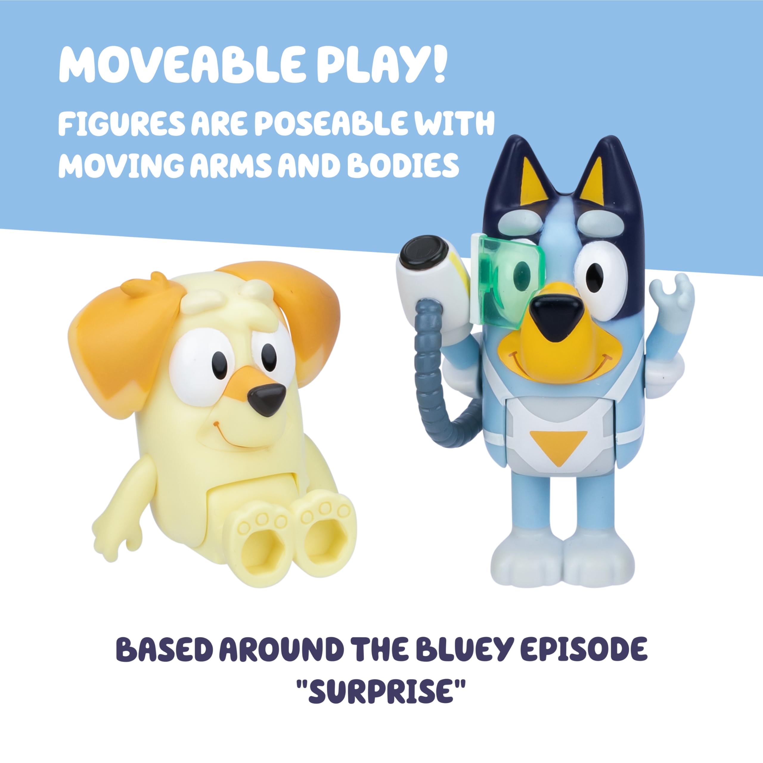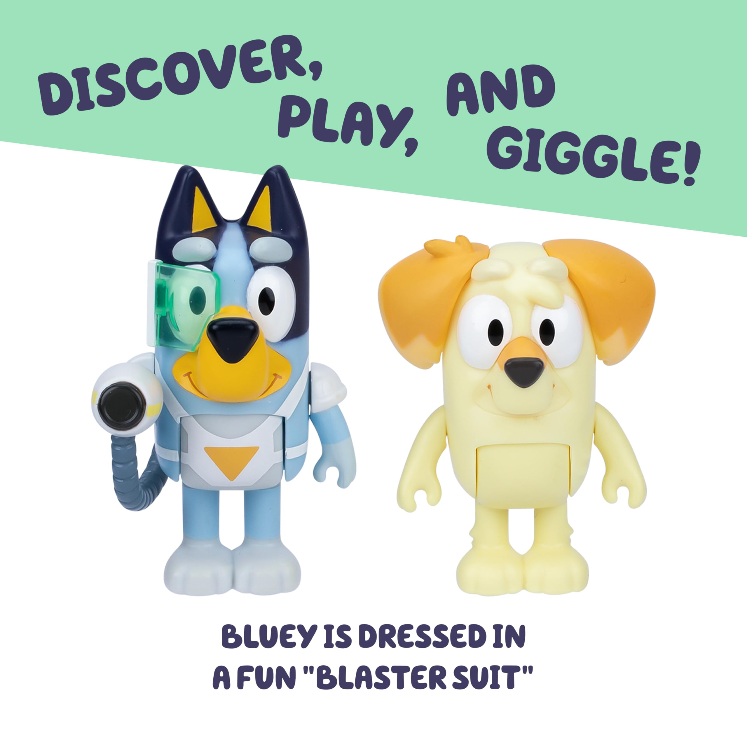 Bluey Blaster Suit Pack: Bring the imaginative fun of Bluey home with our toddler figurine toys inspired by the Bluey TV show episode “Surprise”; this Bluey playset includes 2 Bluey character figures ready for every playtime adventure