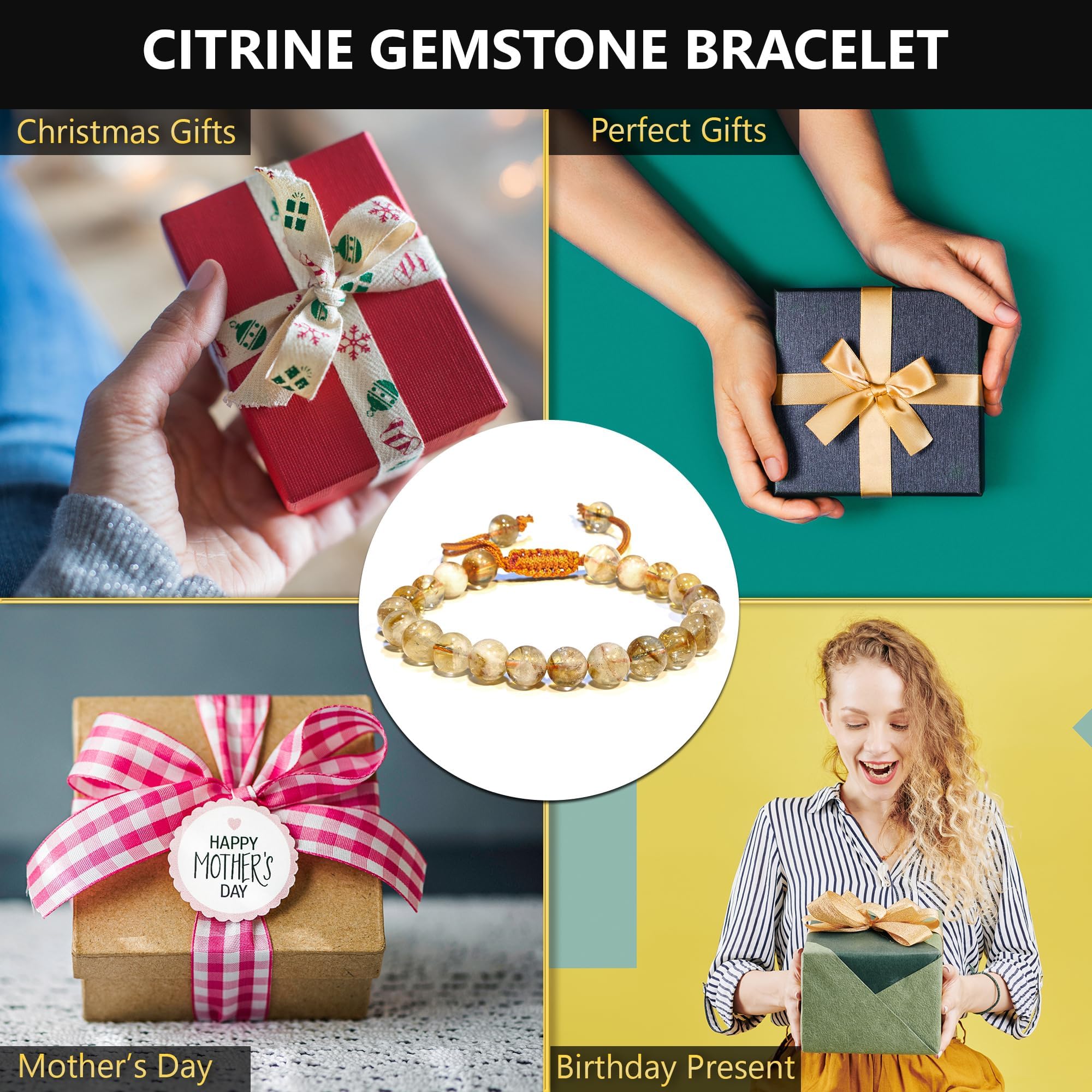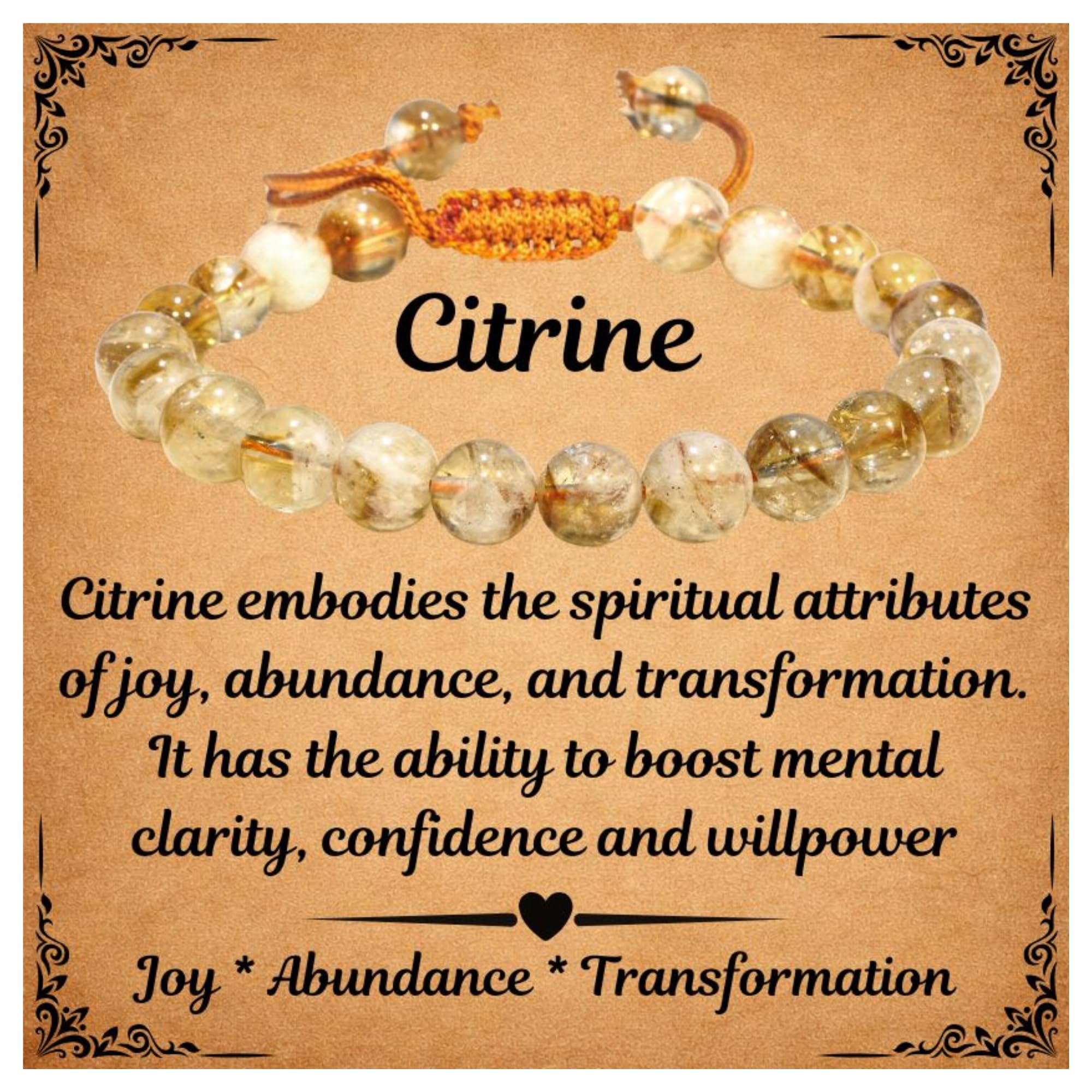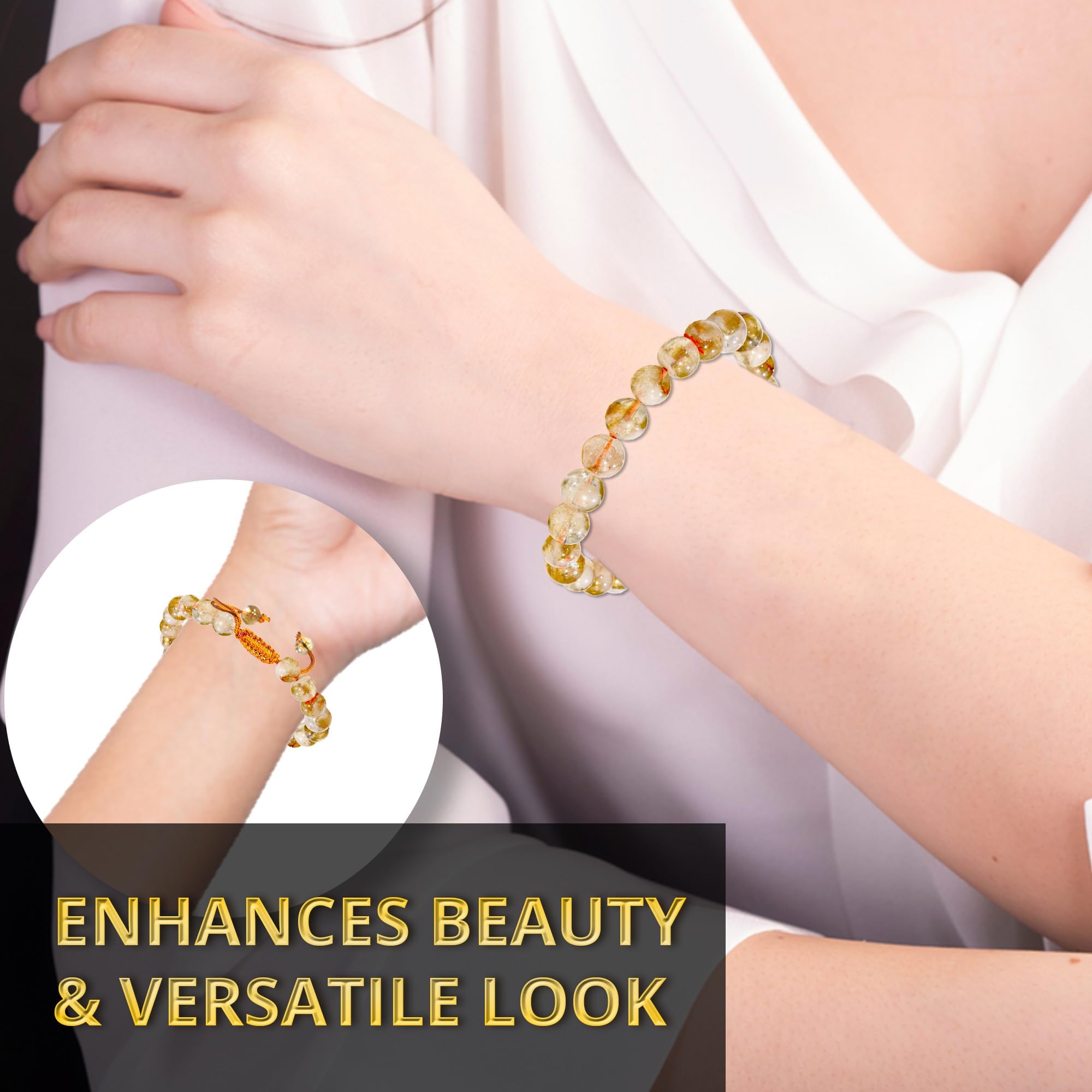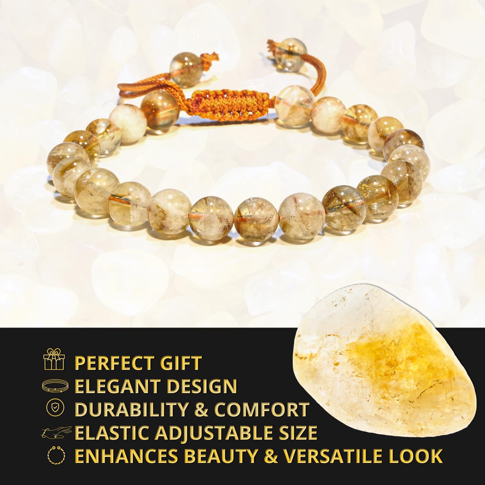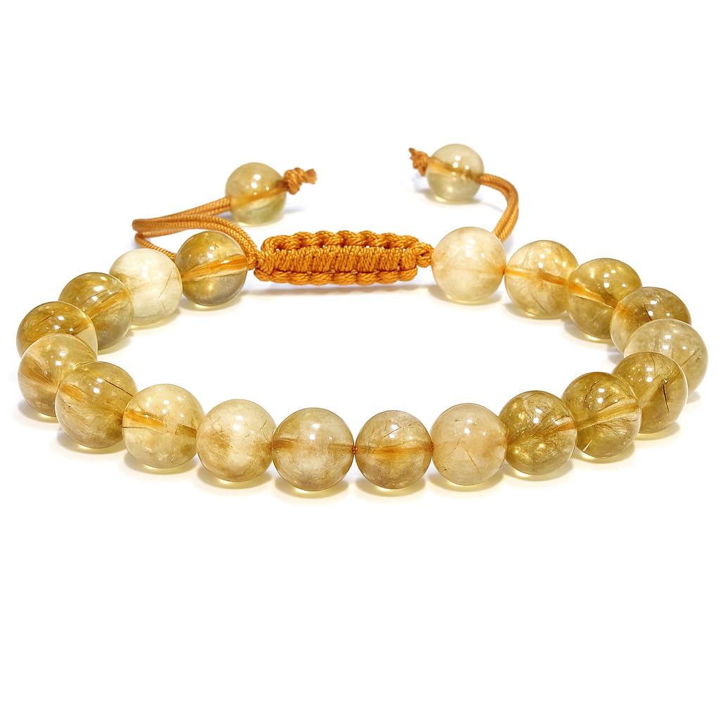 Citrine Crystal Bracelet: Our Citrine healing bracelets for women and men are made with high-quality, carefully selected real gemstones, smoothly rounded to perfect 8mm beads and an elastic string with macrame closure for comfortable and long-lasting wear.