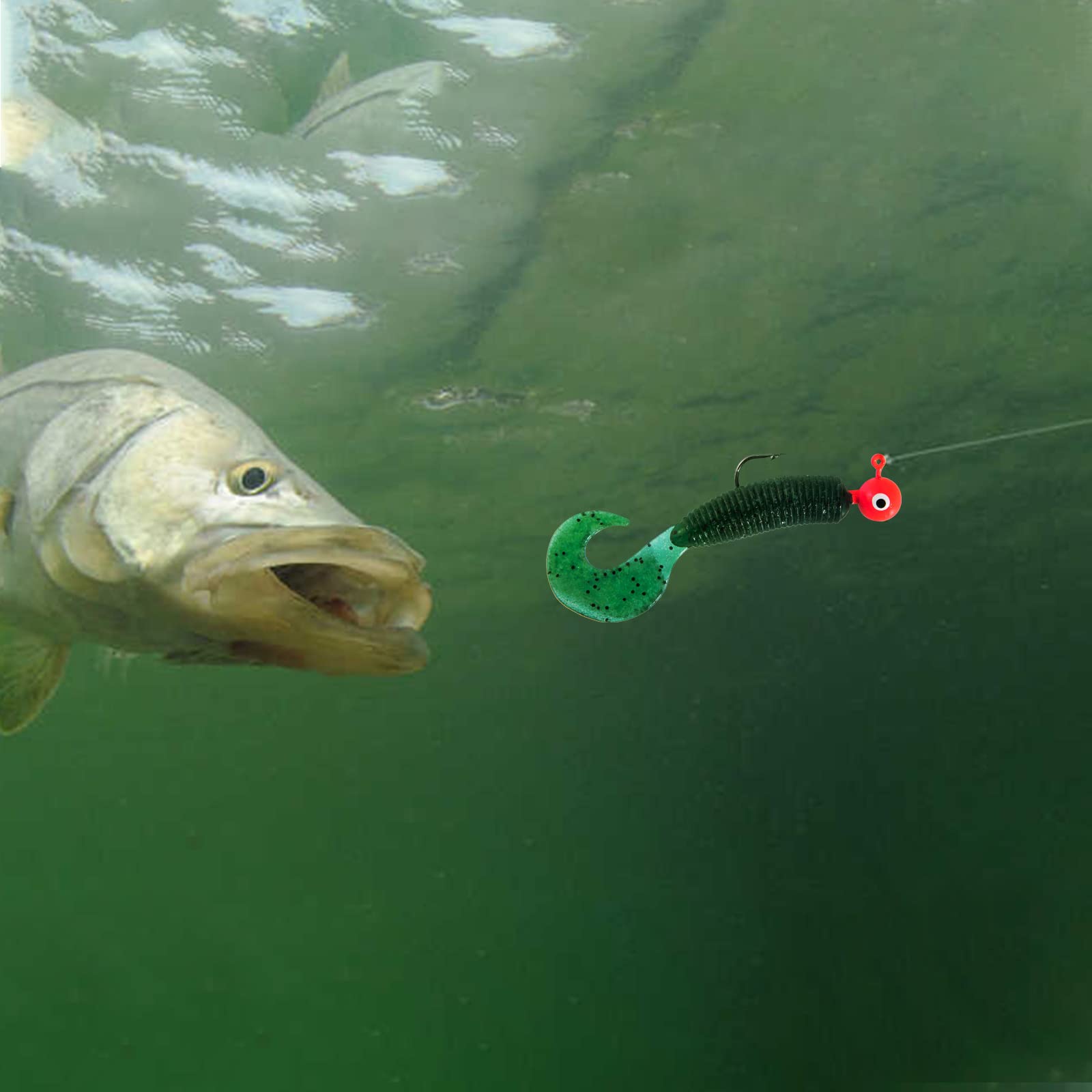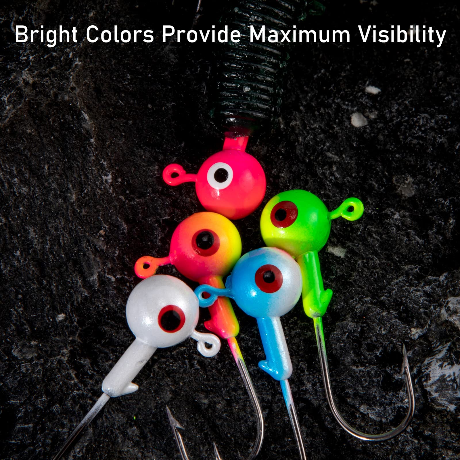 The jig head with dotted eyes is highly effective in attracting fish, triggering aggressive strikes and bright colors provide maximum visibility, increasing your chances of a successful catch.