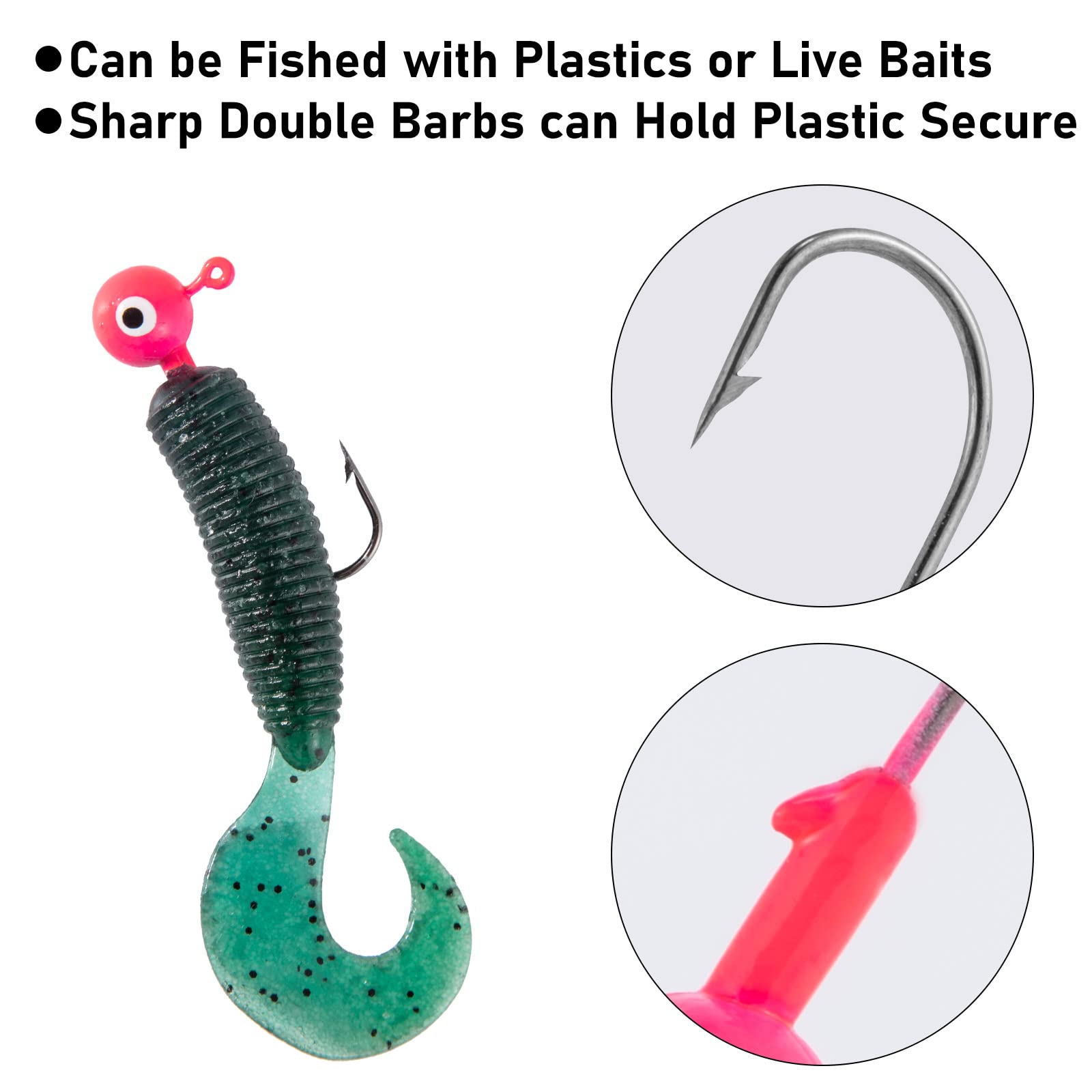 Easy to install your live baits or plastic. Make your soft plastic look like live prey. Eye jig head has sharp double barbs that can hold soft lure securely.