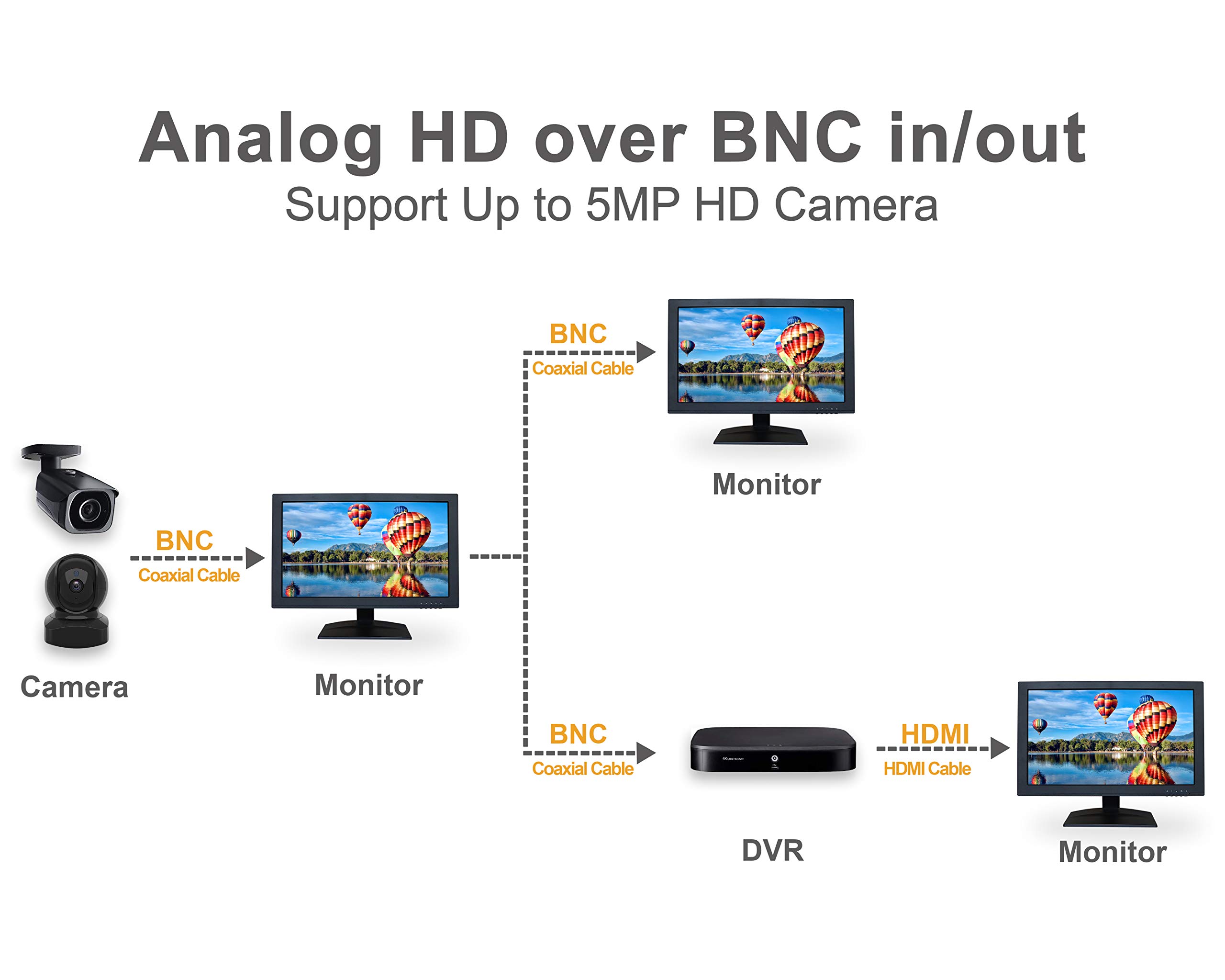 Seamless Connectivity for Security Camera Systems: Our monitor offers versatile connectivity options, including 1x HDMI input, 2x BNC inputs and 2x BNC outputs, making it compatible with various security camera systems. Enjoy seamless integration and easy setup for a reliable monitoring solution.