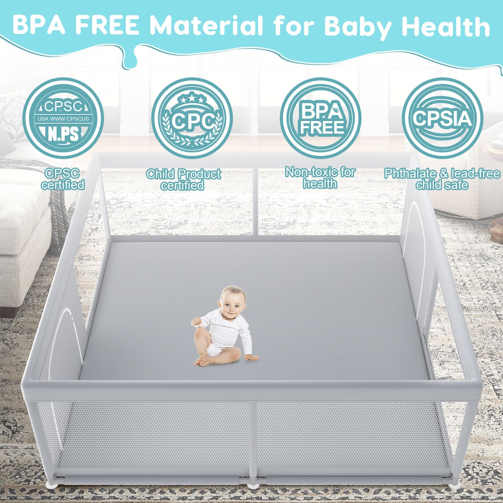 [SAFETY & HIGH-QUALITY MATERIAL]The material used in our toddler playpen have been certified by the CPSC and ASTM. The fabric is made from high quality waterproof Oxford cloth, which quickly absorbs accidental spills, preventing stains. The frame of the playpen is BPA-free, so it can be used with confidence, and there are many sturdy non-slip safety suction cups on the base that make it difficult to move or tip over. Outside zip design prevents baby from climbing out of the playpen by themself.