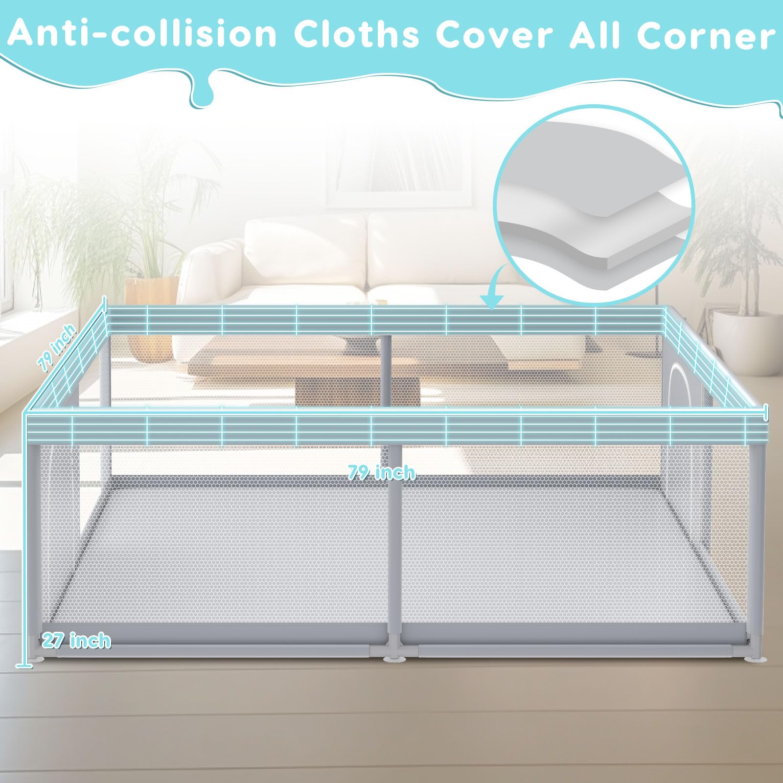 [ EXTRA LARGE BABY ACTIVITY CENTER] The size of our baby playpen is 79*79*27 inches, the whole playpen area is 43.34 square feet, which can accommodate 6-8 babies to play together at the same time, giving your baby enough space to play, crawl and explore. The scientific height design helps baby practice standing and walking.
