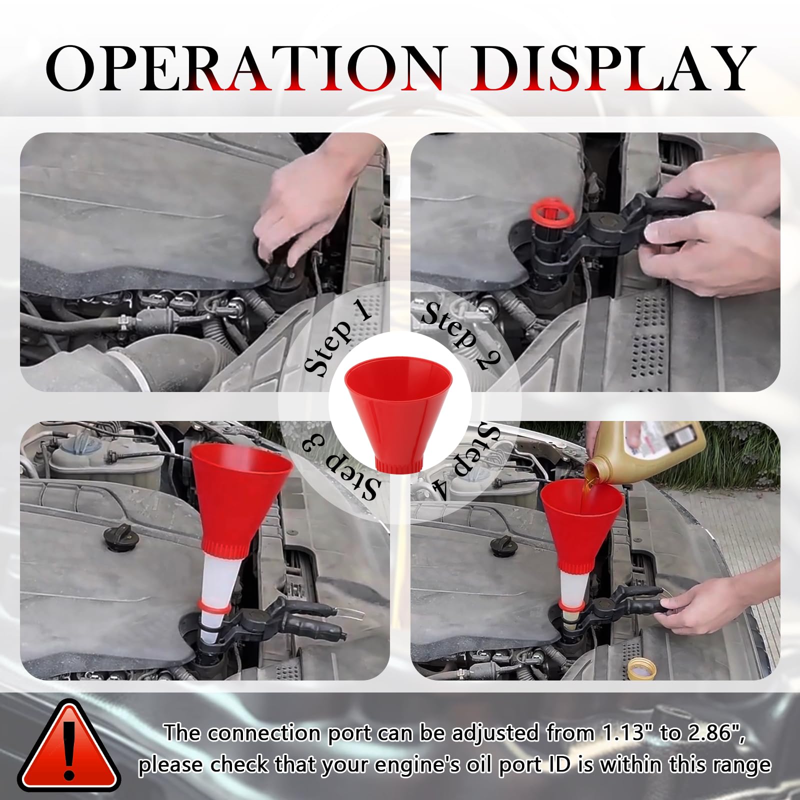 Buyer's Guide: The car funnel has the size of 10.53*7.48*4.92", the top opening ID is 4.79", connection port can be adjusted from 1.13" to 2.86" for accommodate more oil filler opening ID, please check that your engine's oil port ID is within this range