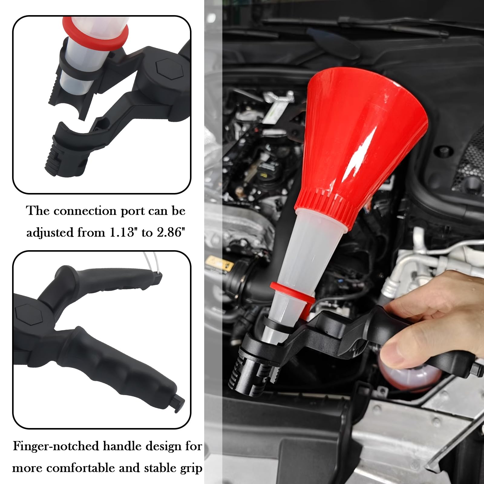 MULTI FUNCTIONAL CAR ENGINE OIL FUNNE, MAKE EVERY LIQUID TRANSFER MORE CONVENIENT Product Information Size: 10.53 * 7.48 * 4.92 inch Weight: 12.90 oz Color: Red Material: Plastic Package: 1 * Red Flared Funnel, 1 * Transparent Lower Chamber, 1 * Black Locking Mechanism, 1 * Red Ring Clip Warm Reminder The connection port can be adjusted from 1.13" to 2.86", please check that your engine's oil port ID is within this range Product Feature Easy to store, with detachable components Easy to clean, simply rinse with water and leave to dry Adaptive clamp design, the width of the clamp opening can be automatically adjusted to the diameter of the fuel filler port Product Function The funnel can be used to fill engine oil, fuel, diesel, gasoline, kerosene, coolant, brake fluid, automatic transmission fluid, windshield washer fluid, water, and other liquid Product Assemble 1. Screw the transparent lower chamber into the red flared funnel. 2. Slide the red clip on the transparent lower chamber into the slot on the black locking mechanism