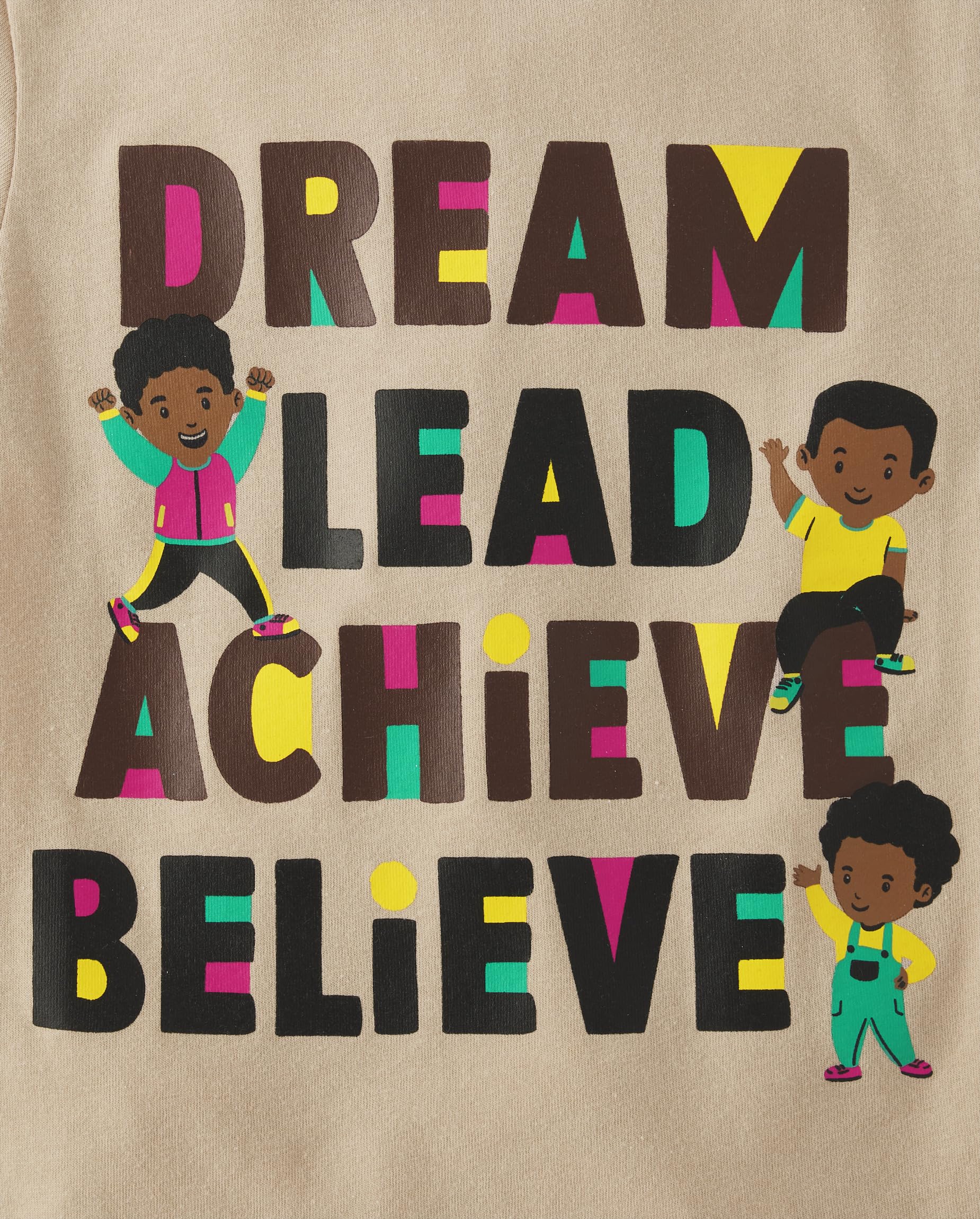 DESIGN — Features short sleeves, rib-knit crew neck, tagless label and 'Dream, Lead, Achieve, Believe' graphic design at front
