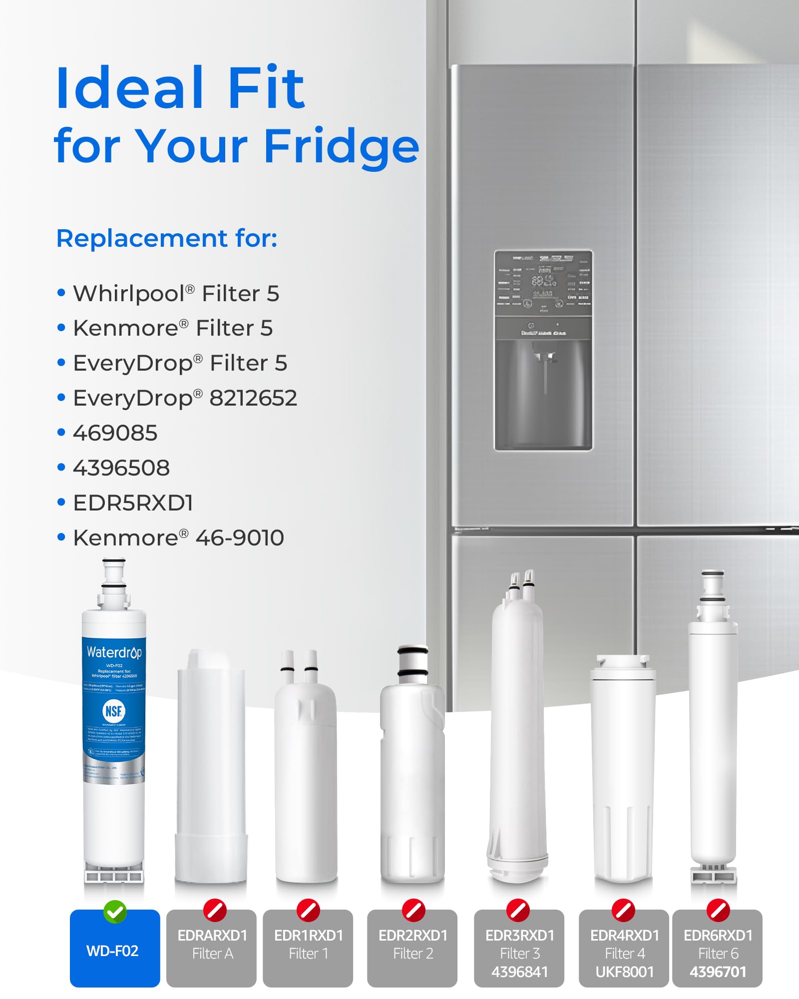 Compatible models: Whirlpool Filter 5, Kenmore Filter 5, EveryDrop Filter 5, EveryDrop 8212652, 469085, 8212652, 4392857R, 4392922, 4396508P, 4396508T, 4396509, 4396509P, 4396510P, 4396510T, 4396562, 4396563, 4396918, 46-9010, 46 9010, 46-9902, 46 9902, 9085, 46-9908, 46- 9908, 4396547, 4396163, 4396548, 4396164, 2255709, 2203980, 2305767, 2305768, 2255518, 2186444, 2203980, WF-NL240V, WF-L400V, WFL500, WF-L500, WFLC400, WFLC400V, WF-NLC250, WF-NL300, WF-l500, NLC240V, NL240, NL240V, NL300