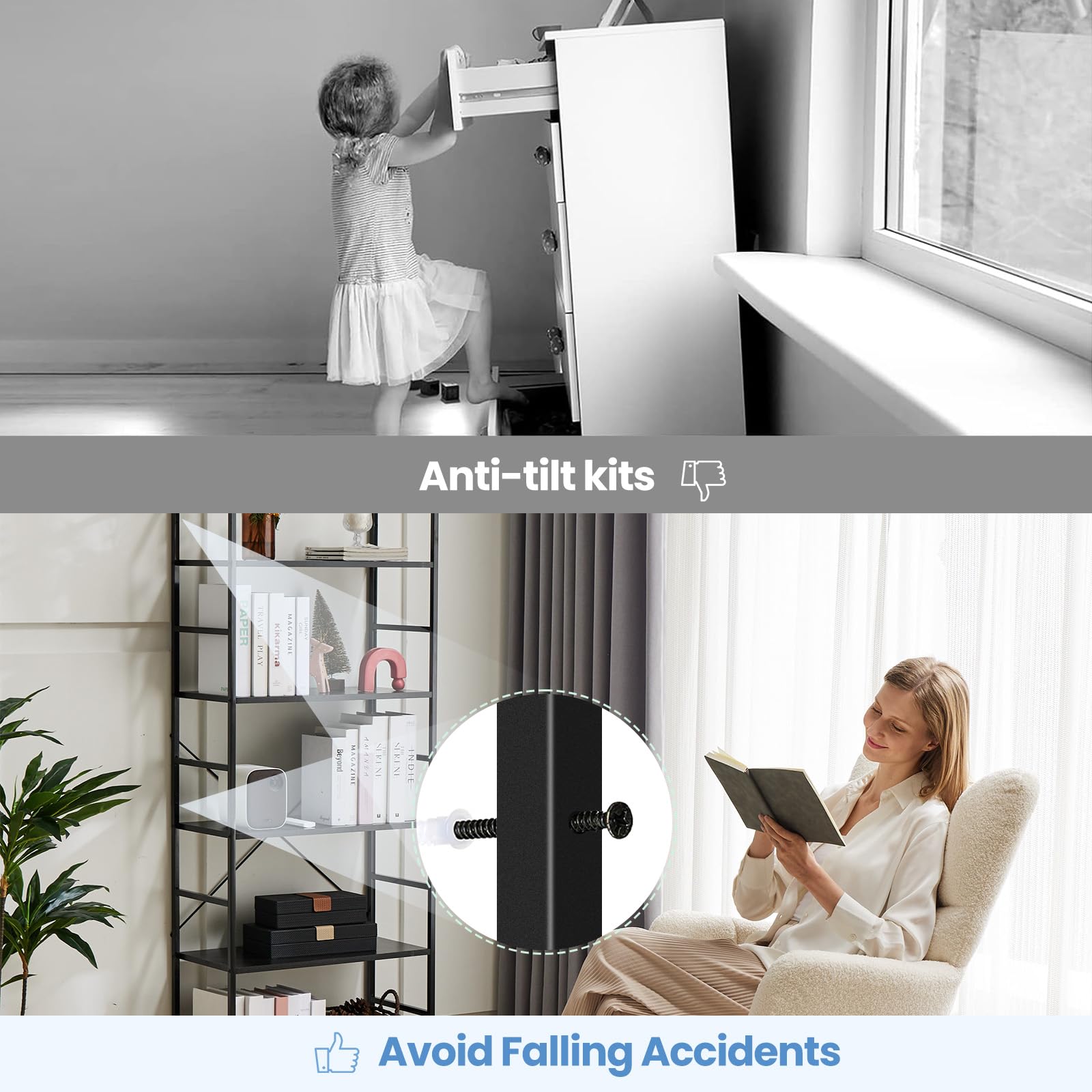 【Anti-Tip Kits and Easy Assembly】:Anti-tipping tools for wall mounting are included, enhancing stability and safety. Our comprehensive installation video ensures easy assembly, allowing you to set up your new bookshelf quickly and begin enjoying its benefits right away.