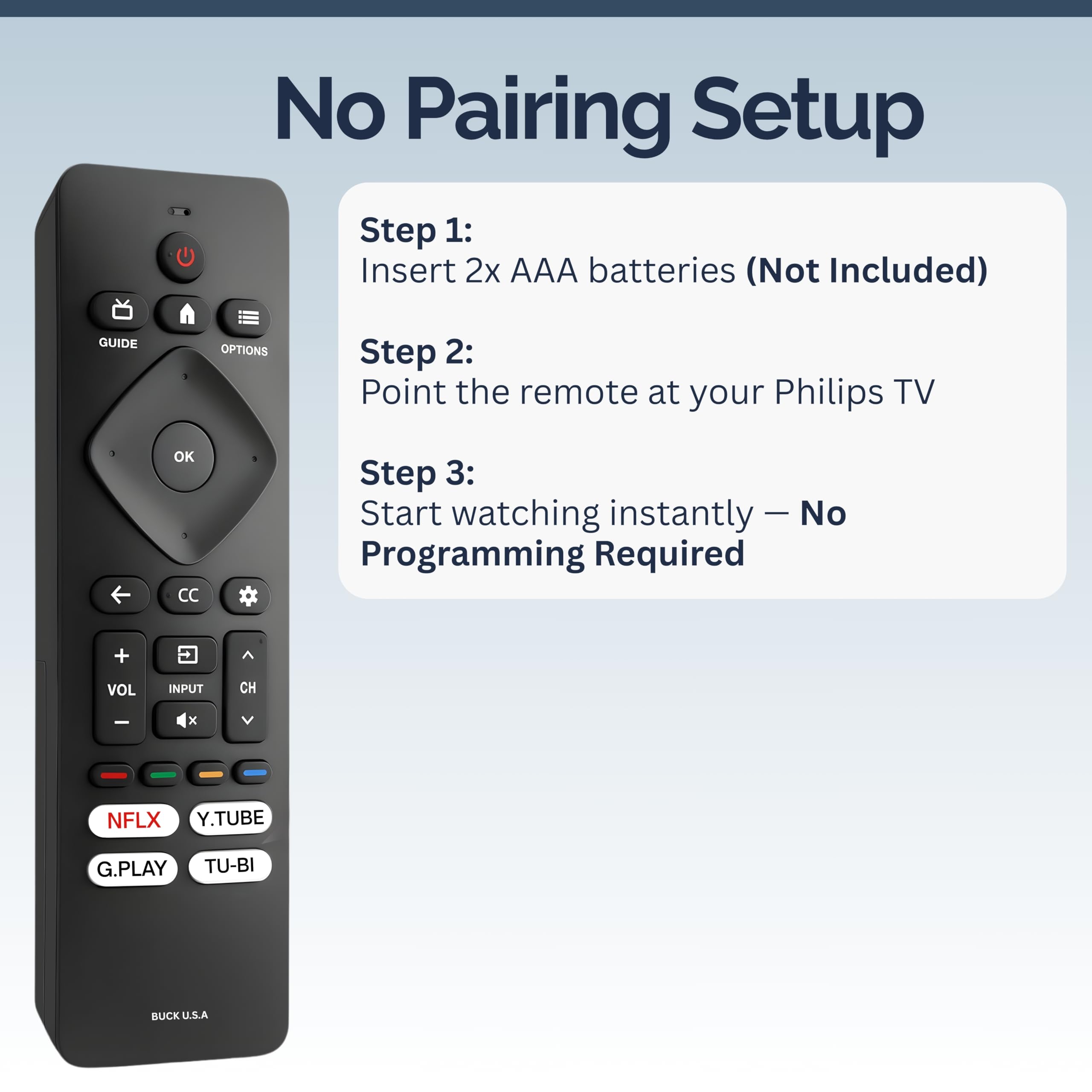 Easy Setup: No programming or complex codes required. Simply insert 2 × AAA batteries (not included) and the remote will work instantly with your Philips Smart TV.
