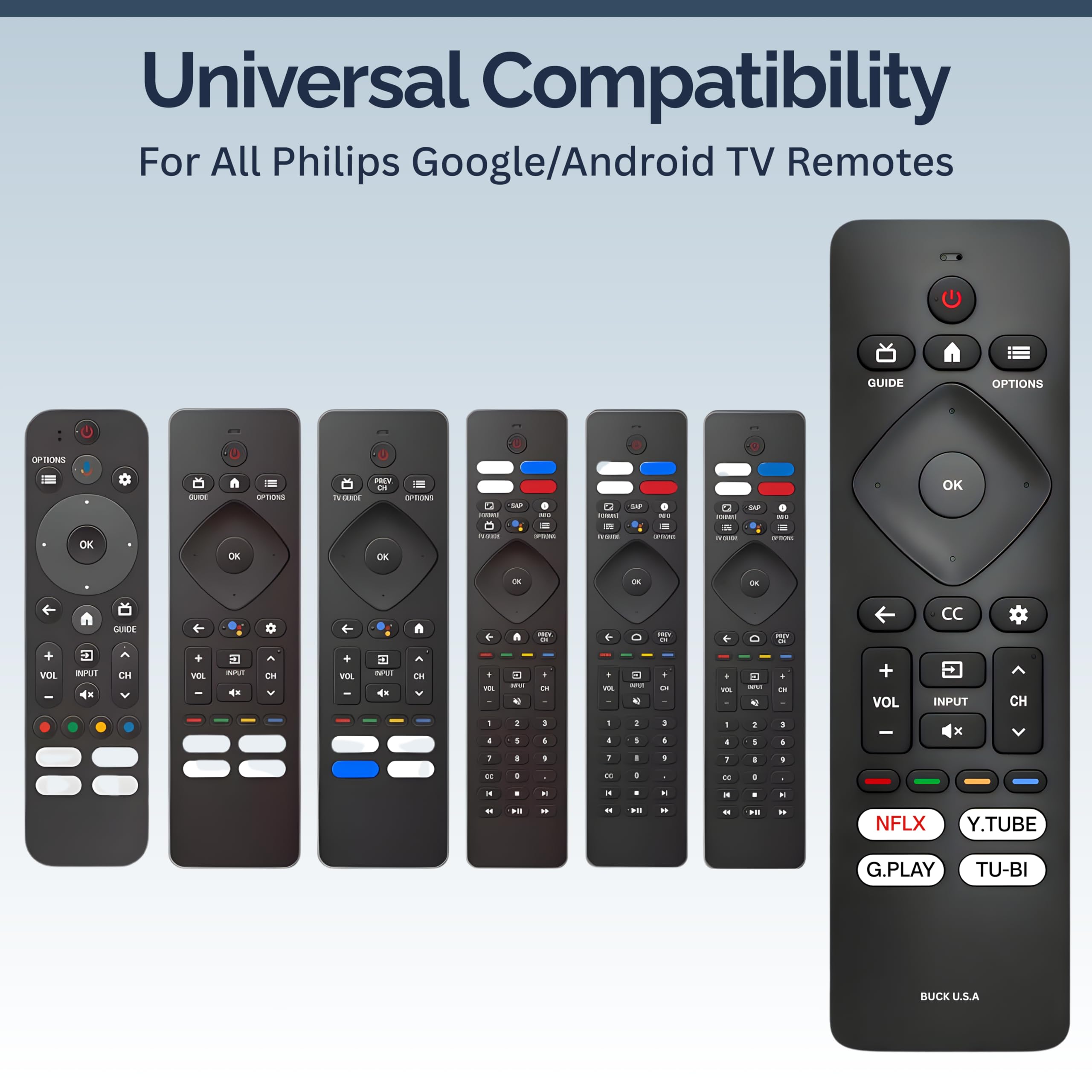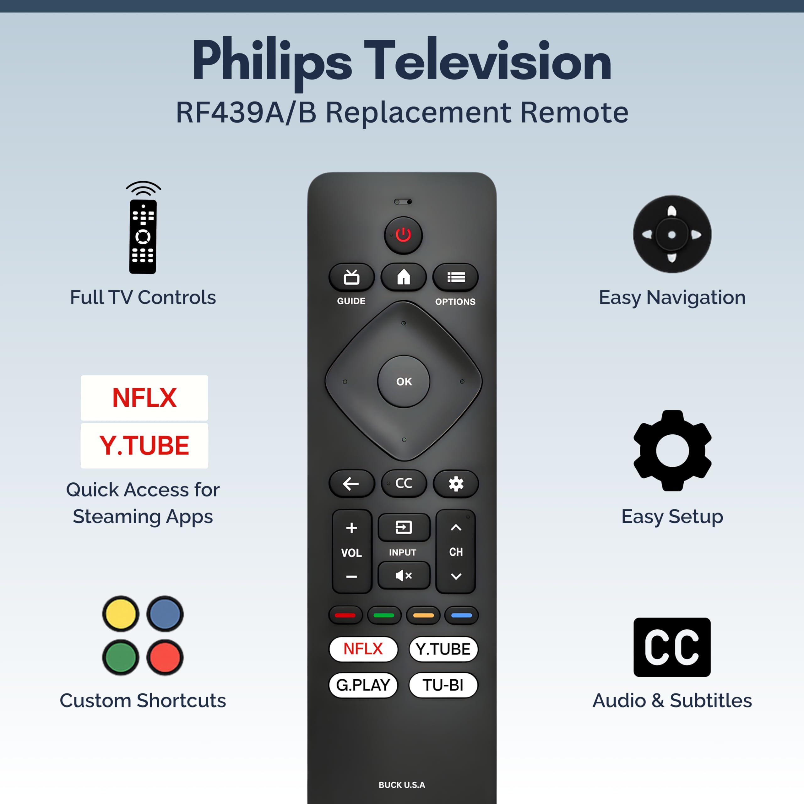The RF439A Replacement Remote Control is the ideal solution for Philips 4K Smart TV owners looking to restore full control over their home entertainment system. Specifically engineered to support both the Android TV and Google TV platforms, this remote provides a seamless transition for users with series ranging from the 5500 and 5700 up to the premium 7600 models. Unlike universal remotes that require frustrating programming codes, this unit is designed for instant integration—simply insert two AAA batteries and you can immediately begin navigating your favorite menus and settings. Beyond basic functionality, this remote prioritizes speed and convenience through its tactile layout. The face of the controller features four dedicated high-speed shortcut buttons, allowing you to launch Netflix, Prime Video, Google Play, and Tubi with a single press. The hardware inside has been upgraded for 2025 to ensure a lightning-fast response time of under 0.5 seconds, while the powerful transmitter provides a reliable connection even from across large living rooms. Comfort and longevity are at the core of the RF439A’s design. The lightweight, contoured housing fits naturally in the hand, while the high-elasticity buttons are built to withstand heavy daily use. It is important to note that this specific model is a standard replacement intended for straightforward button-based navigation; therefore, it does not include a microphone or support voice command features. This makes it a dependable, no-fuss choice for households that prioritize durable, direct control over their Philips 4K LED display.