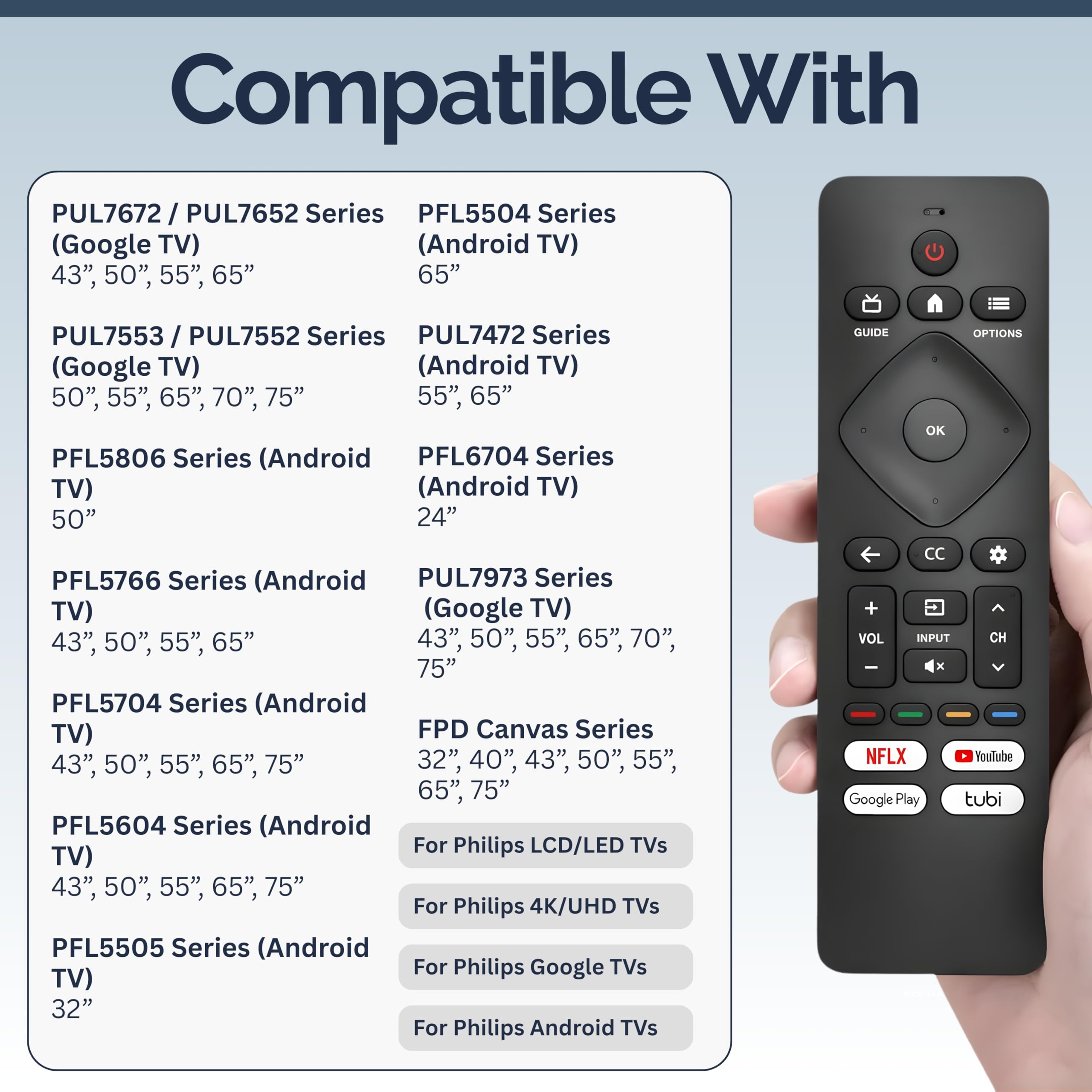 Compatible With: Philips Android and Google TV Series 7672, 7652, 7553, 7552, 5806, 5766, 5704, 5604, 5505, 5504, and 7472. A wide range of specific compatible models includes: 32PFL5505, 43PFL5604, 43PFL5766, 50PFL5604, 50PFL5806, 50PUL7672, 55PFL5604, 55PFL5766, 55PUL7472, 55PUL7552, 55PUL7672, 65PFL5704, 65PFL5766, 65PUL7472, 65PUL7552, 65PUL7672, 70PUL7553, 75PFL5604, 75PFL5704, and 75PUL7552.