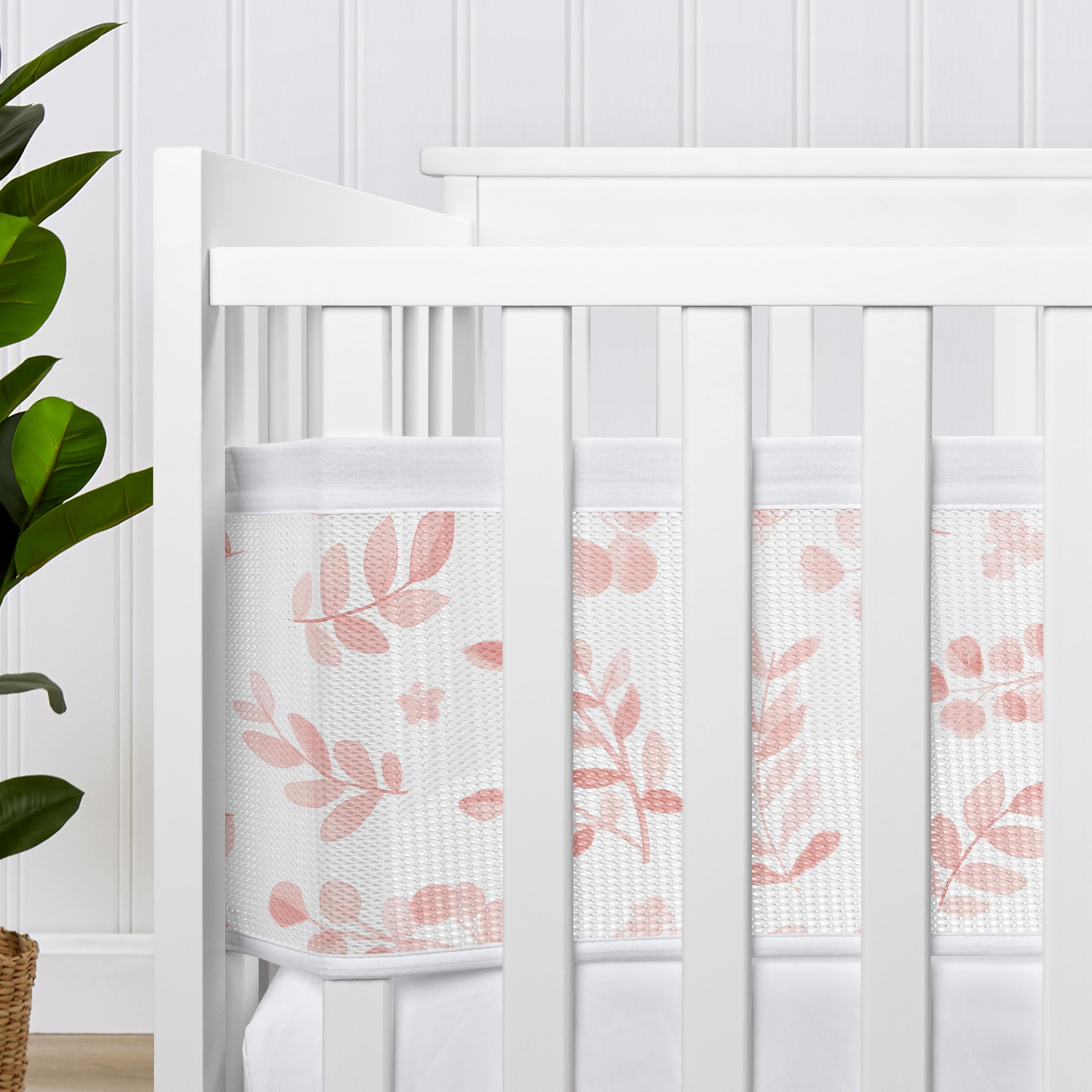 This mesh crib liner features a botanical boho chic watercolor bohemian woodland floral leaf flower print with complimentary color palette from the matching Sweet Jojo Designs Botanical Pink bedding collection of blush pink and white.