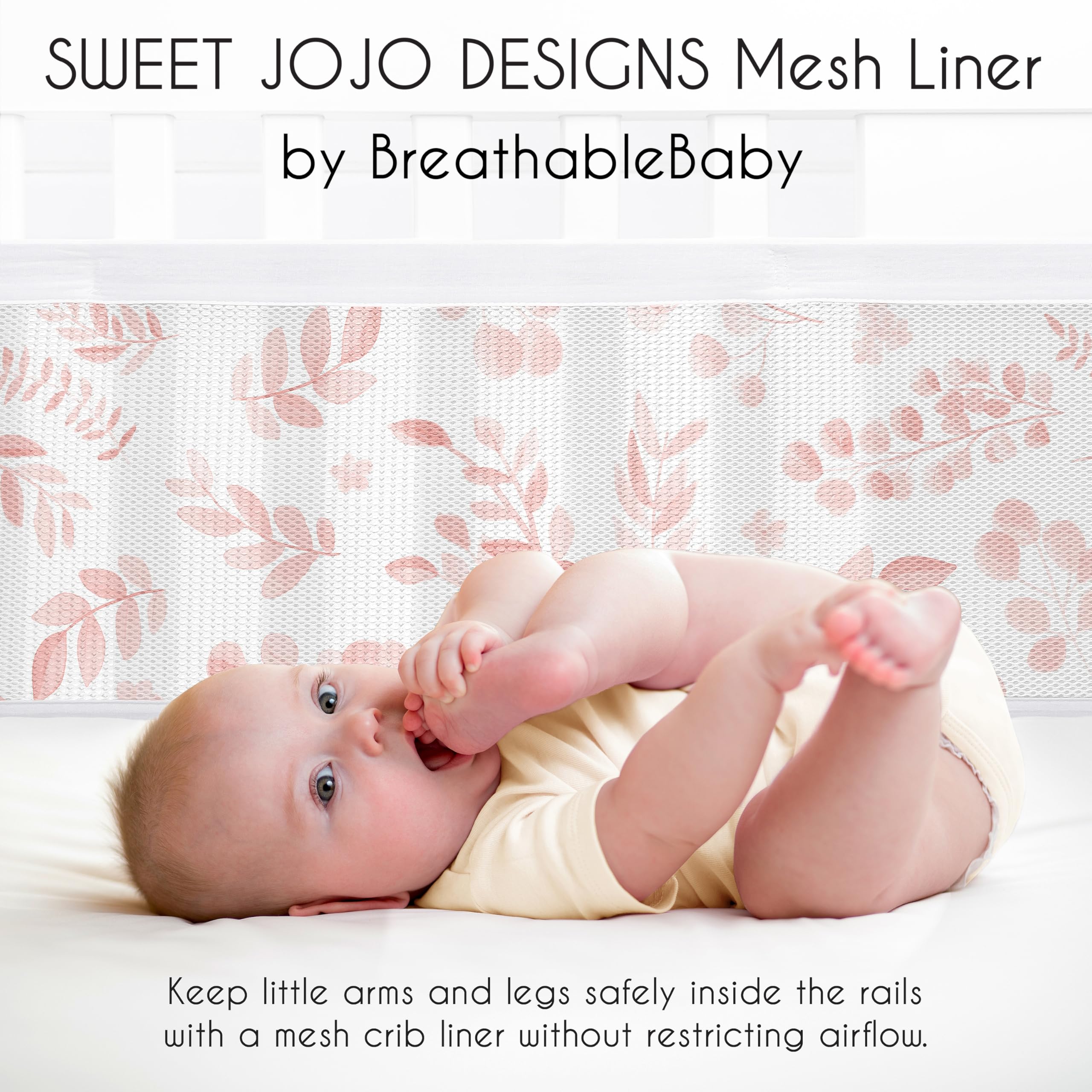 Mesh crib liners are essential for providing the ideal solution to a painful and disruptive problem: helps keep arms and legs safely inside the crib without the risk of restricted airflow. And, as an added bonus, besides perfectly matching your Sweet Jojo Designs baby bedding set, mesh liners also provide a visual shield to help provide a more peaceful night's sleep. Not to mention, they keep pacifiers inside and within reach!