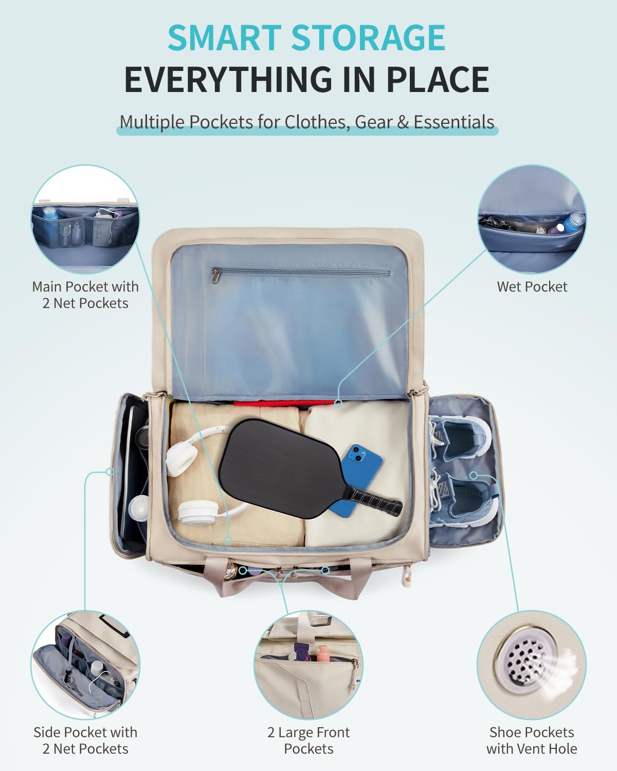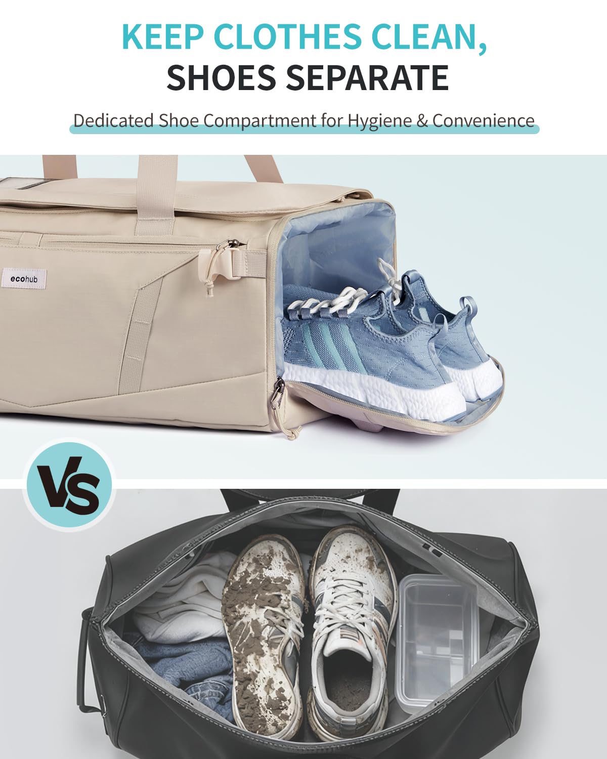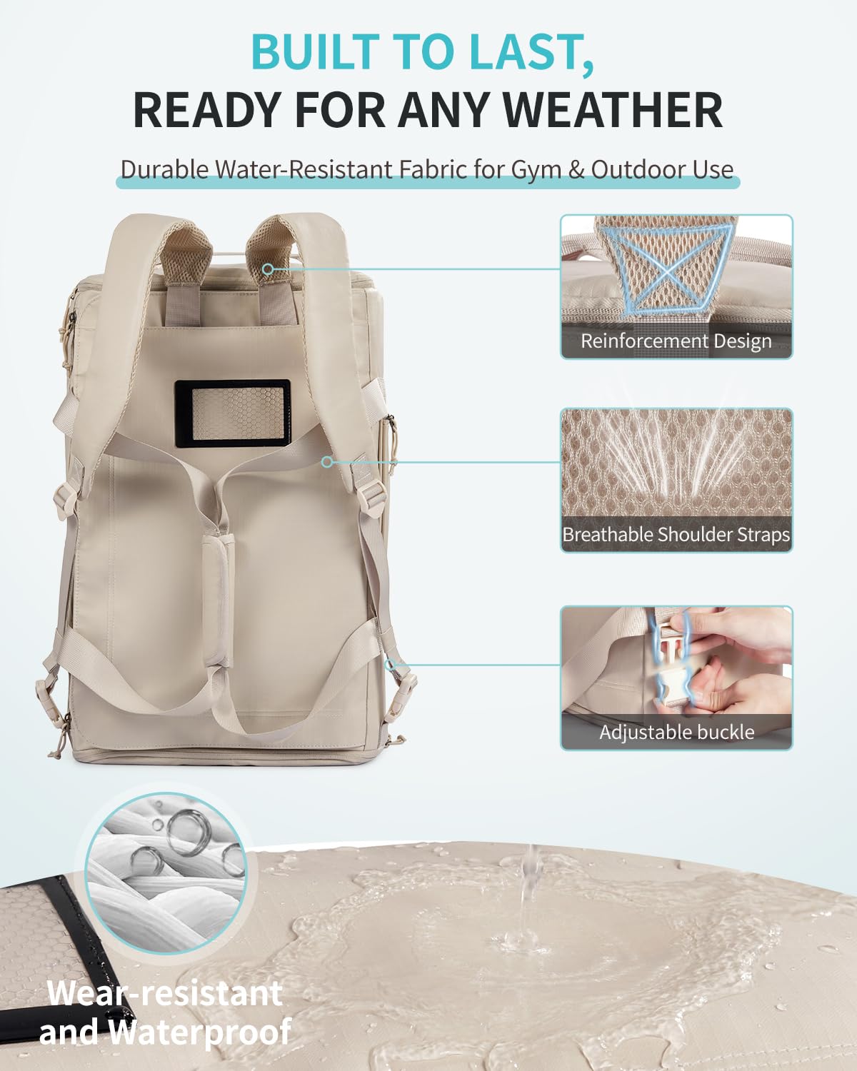 【Spacious & Organized】 40L large capacity with multiple compartments. Dedicated ventilated shoe compartment keeps your sneakers or dirty gear apart from clean clothes, making post-gym packing more hygienic. Built-in waterproof wet pocket holds damp towels or swimwear, while multiple interior and exterior pockets keep essentials organized.