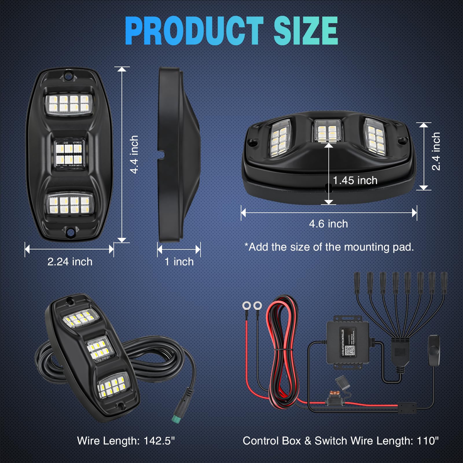 High Quality Materials and IP67 Waterproof: Each RGBW Rock light is made of die-cast aluminum housing, reinforced PC lens and high-quality chips. Built in resistors and voltage stabilizing IC constant current drivers, the intelligent protection circuit is more stable and provides faster heat dissipation. IP67 waterproof level can be used in various harsh environments: including severe cold, wind and sand, heavy rain, scorching heat, etc