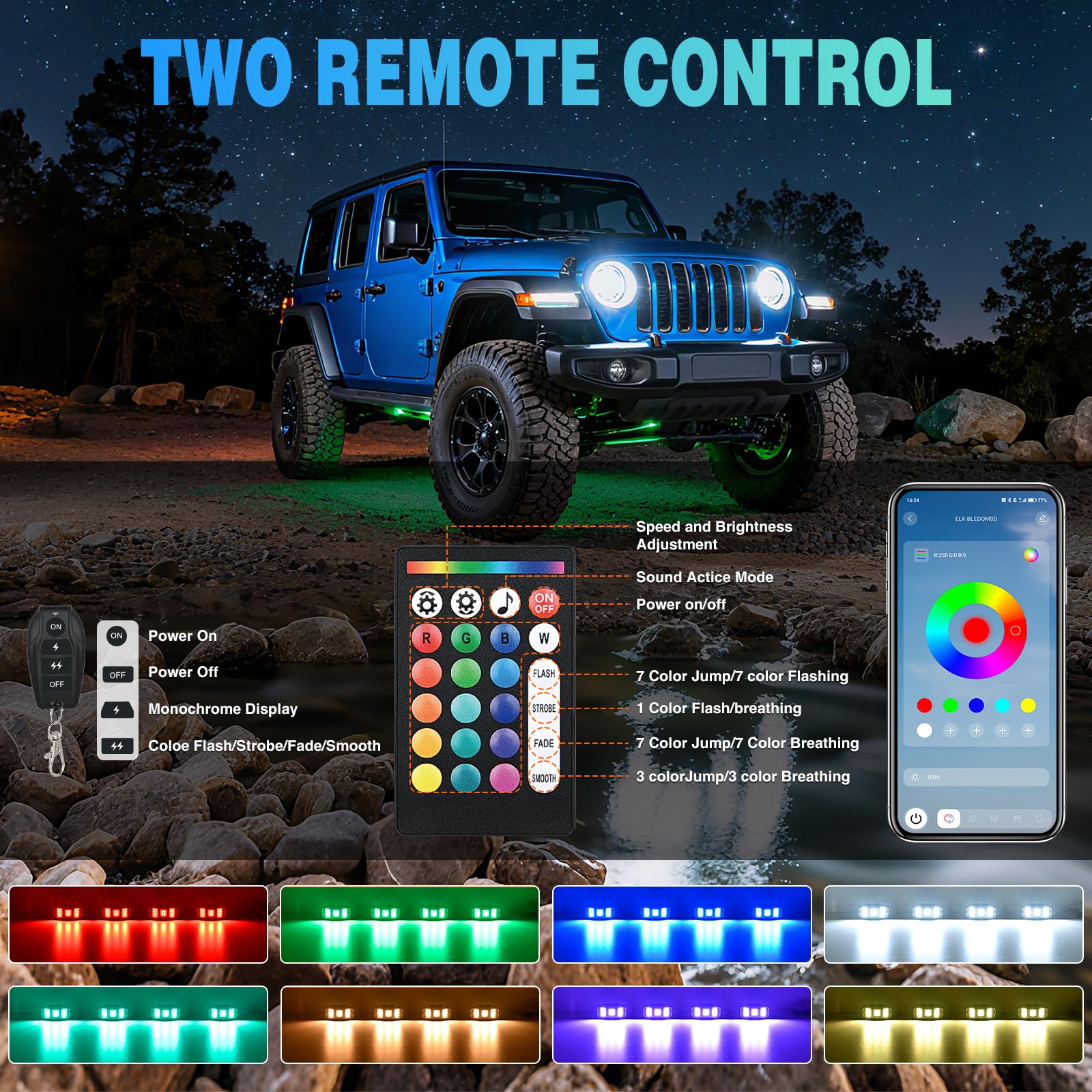 Upgraded Lighting and Wide Angle: 22 upgraded 5050+2835 SMD LEDs deliver brighter, longer lasting light. 210° wide angle covers more area, with 16 million colors, 29 dynamic modes (monochrome/jump/flash/breathing), and 6 scene modes (party/leisure/quiet, etc.). Customize speed, brightness, and strobe for personalized off-road vibes