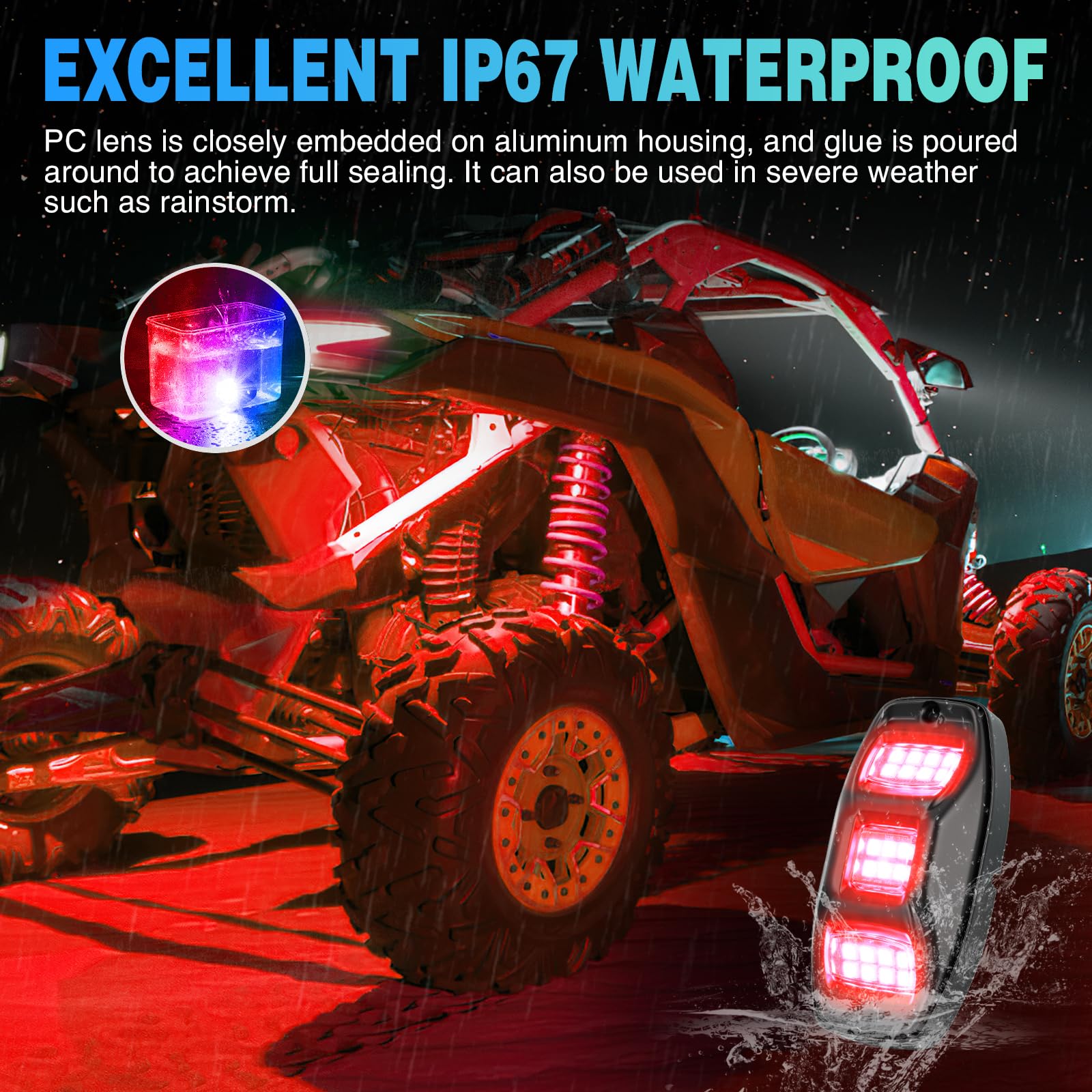 Wide Range of Uses: This RGBW LED rock light can be widely used as decorative lights for cars, off-road vehicles, trucks, ATVs, UTVs, SUVs, motorcycles, ships, golf carts, etc. You can drive your vehicle through any terrain without fear. For example: muddy roads, swamp lakes, wetland grasslands, etc