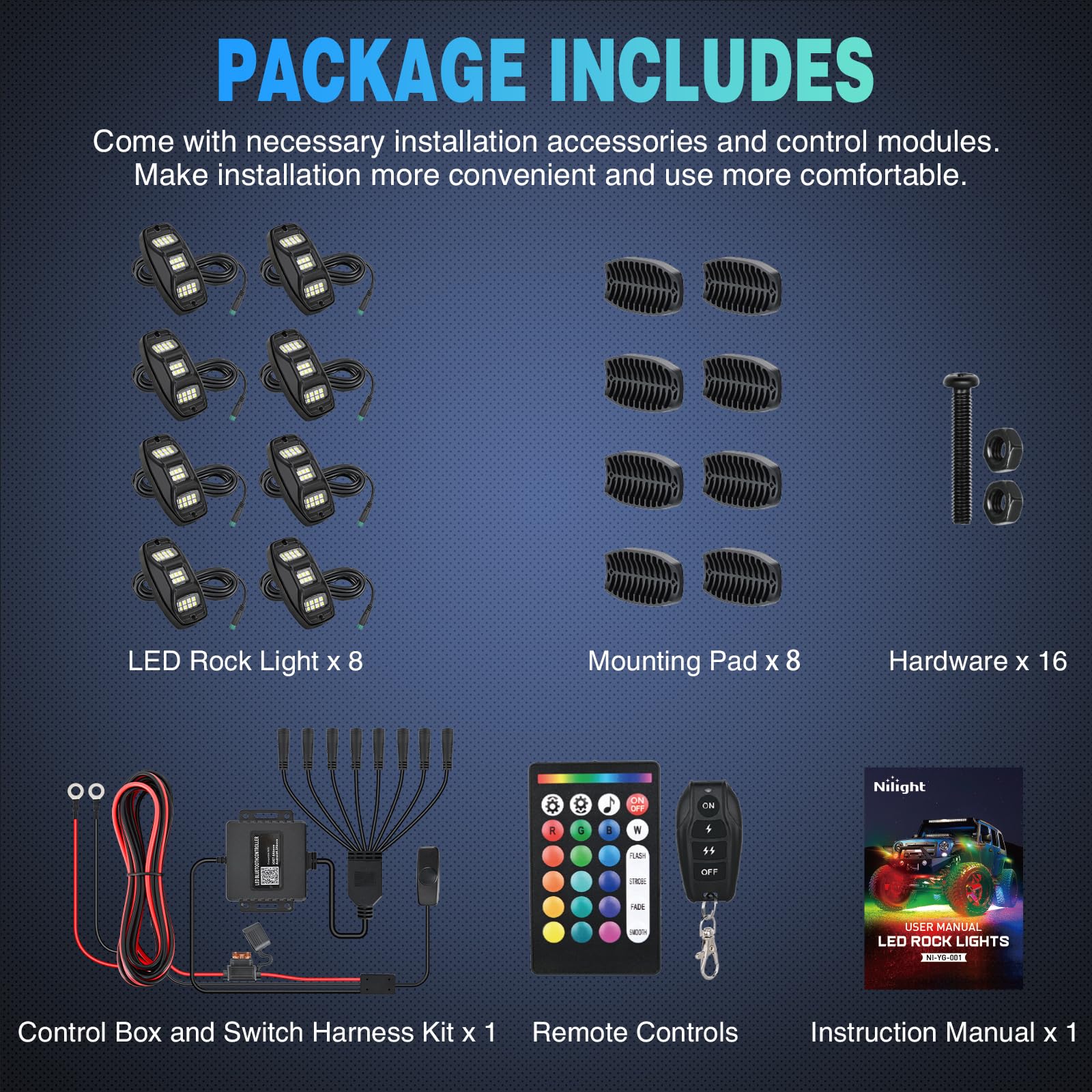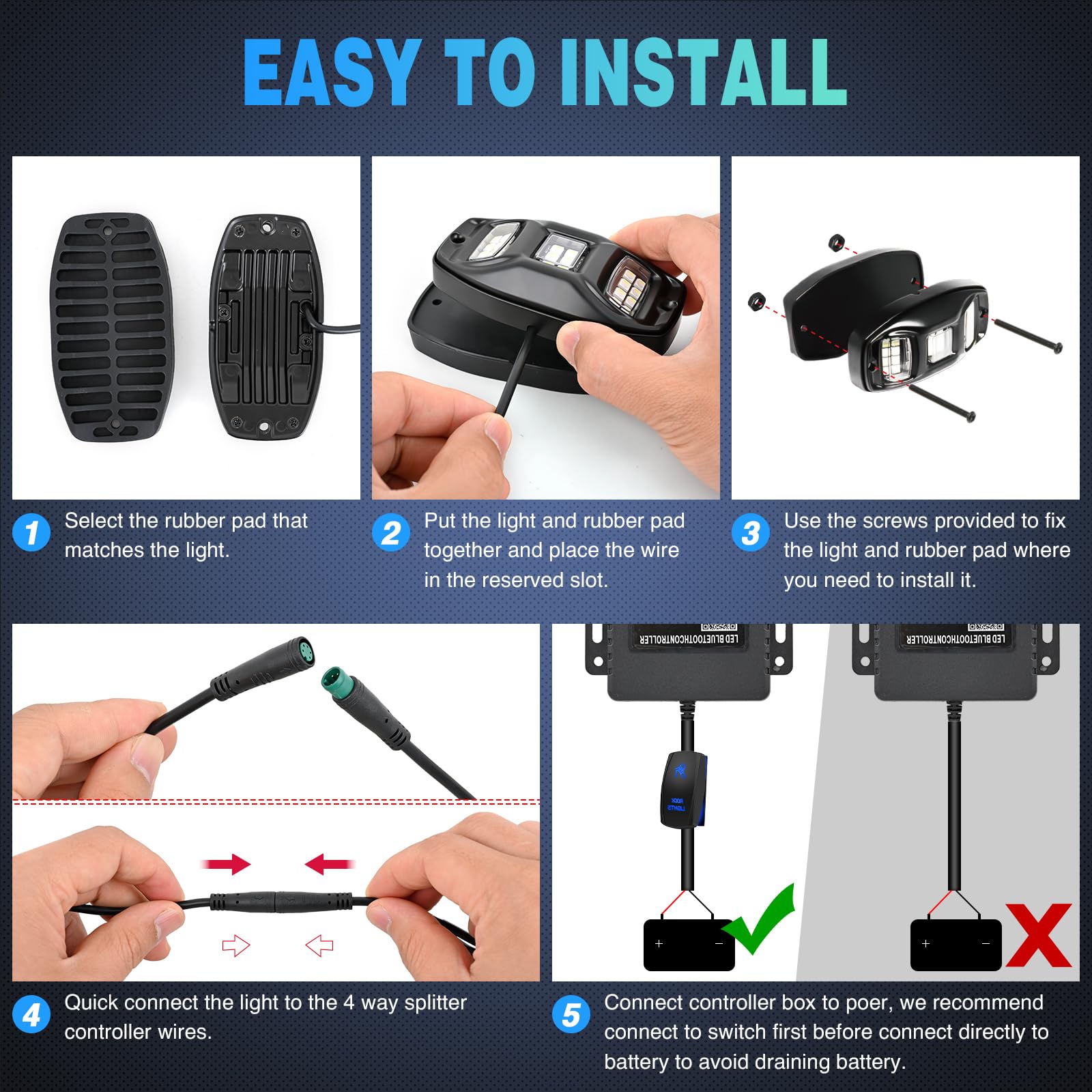 Easy to Install: Equipped with rubber pads and rust-proof hardware, it can be easily installed in a few minutes. You only need to place the light on the rubber pad, then install the light where you need it, connect the light and the wiring harness one by one through the 5PIN plug-and-play connector, and turn on the power to quickly complete the installation