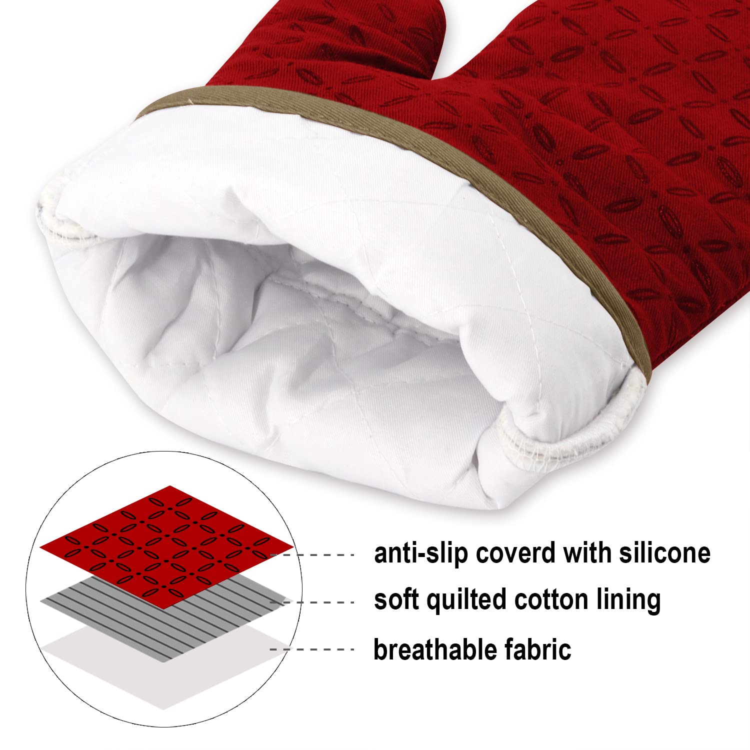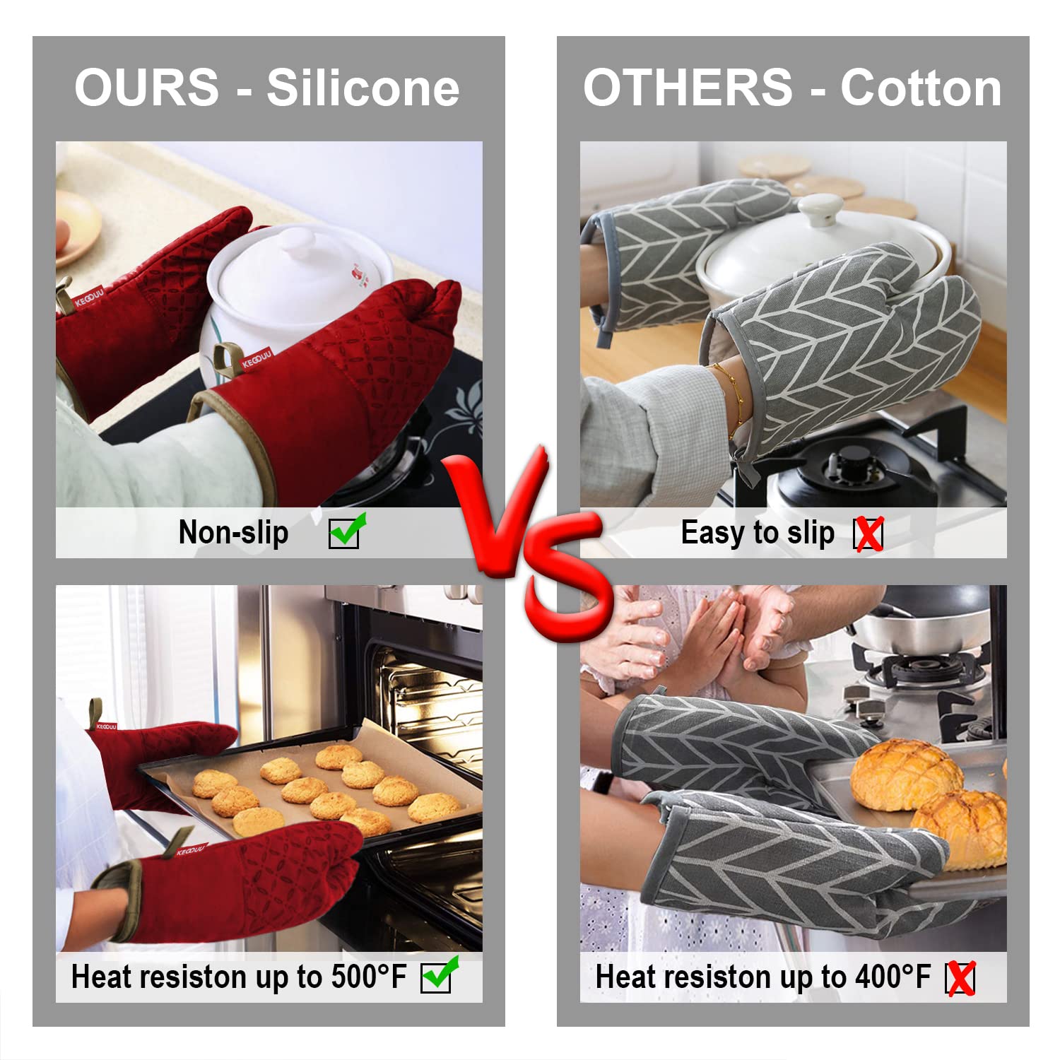 500°F HEAT RESISTANT &NON-SLIP - This oven mitts heat resistant 500 degrees because of the durable construction so it can effectively keep you protected from burning while you enjoy cooking and grilling. Enhanced with anti-slip silicone design to provide a more robust, non-slip grip that can be held securely when handling the kitchen utensils