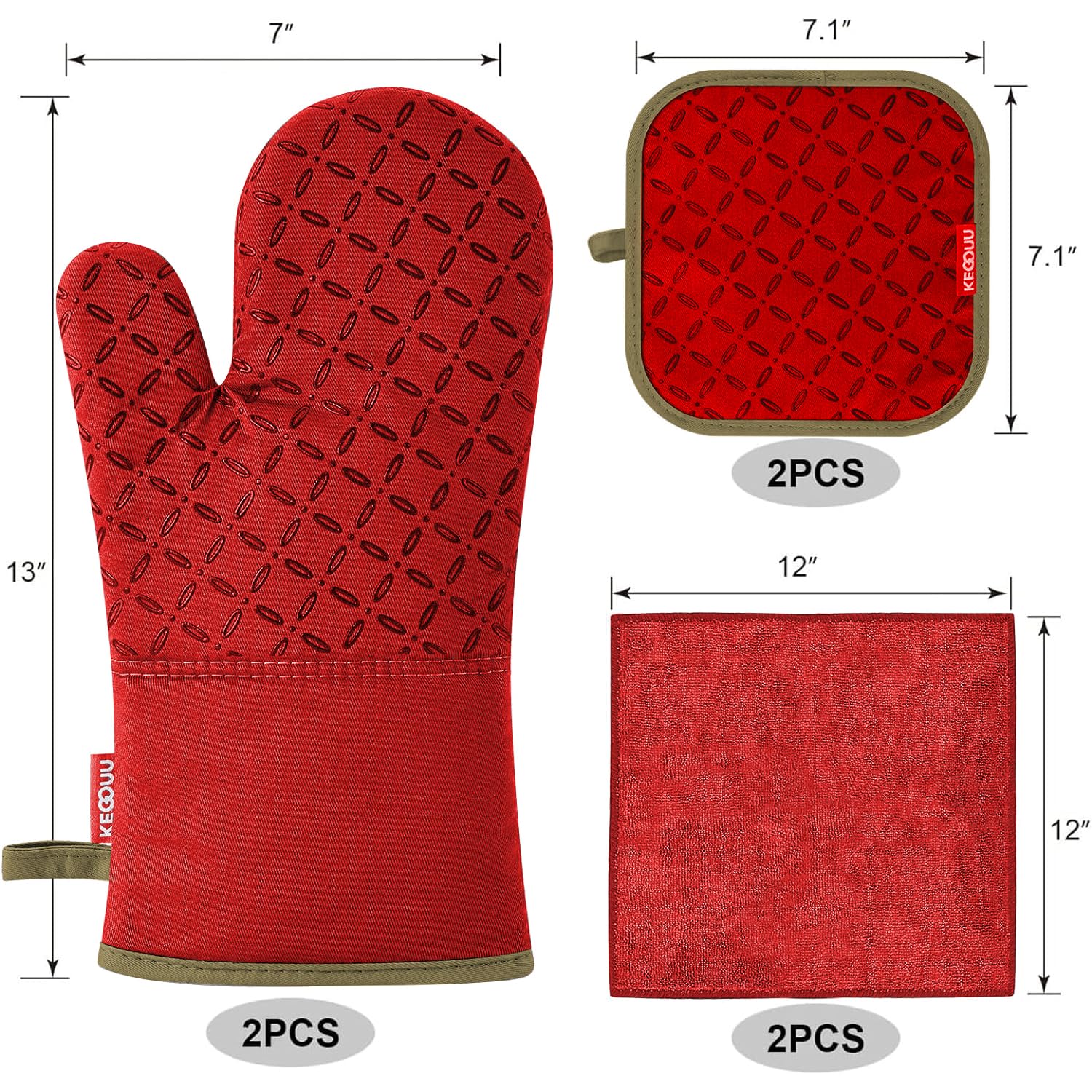 6 PIECE KITCHEN ACCESSORY SETS: -Our oven mitts and pot holders set including 2pcs non-slip surface silicone kitchen oven gloves (7X13in), 2pcs pot holders (7X7in) and 2 kitchen towels (12x12in), fit for indoor cooking, baking,BBQ or outdoor grilling. Also the oven mitt set is a perfect ideal kitchen gift for women, men, baker, cooker