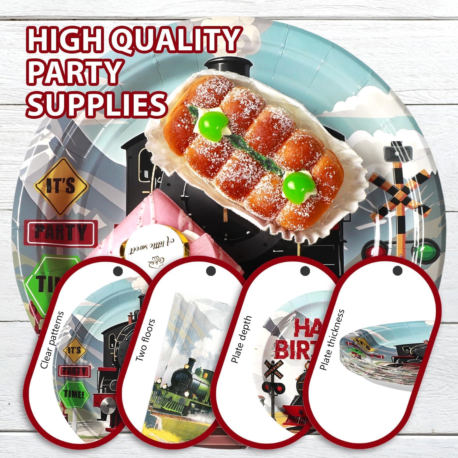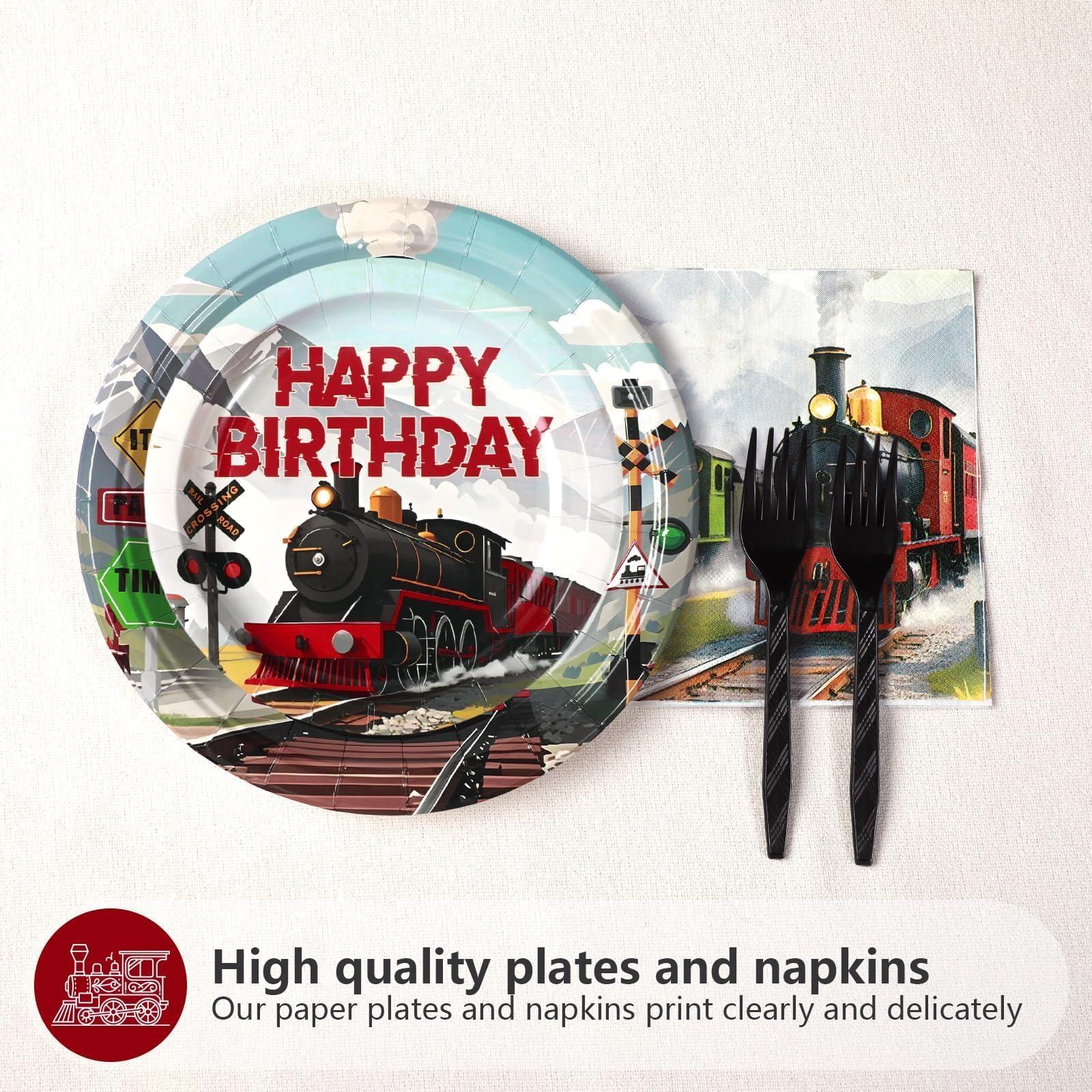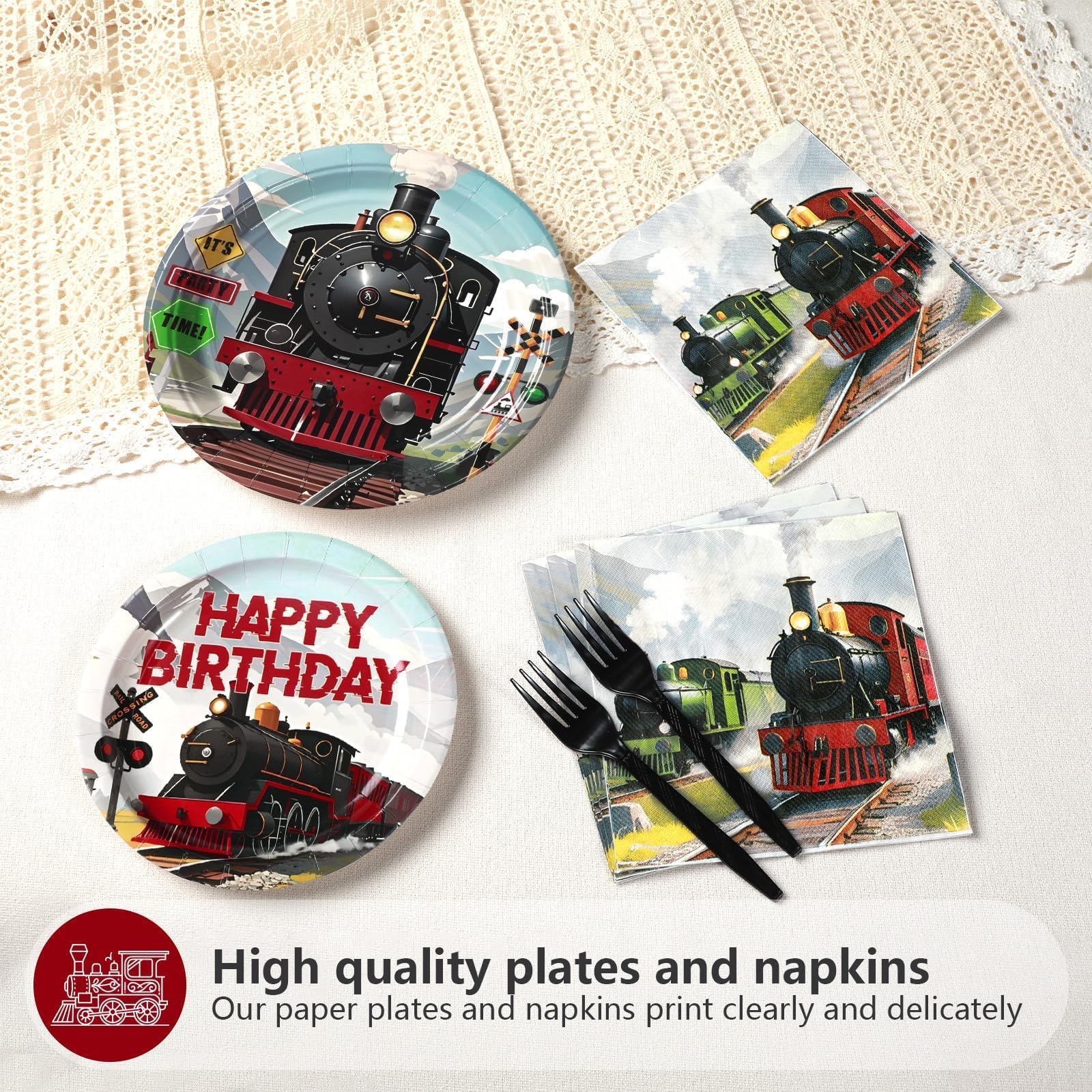 Premium & Safe Materials: The vintage train theme paper plates are made of food - safe, heavy - duty paper, and the forks are made of durable plastic. They can withstand bending and prevent leaks, ideal for serving cakes, snacks, or treats at vintage train birthday parties, whether indoors or outdoors. The vintage train napkins are thick and absorbent, adding a touch of style to the party. (Note: Don’t microwave the plates.)