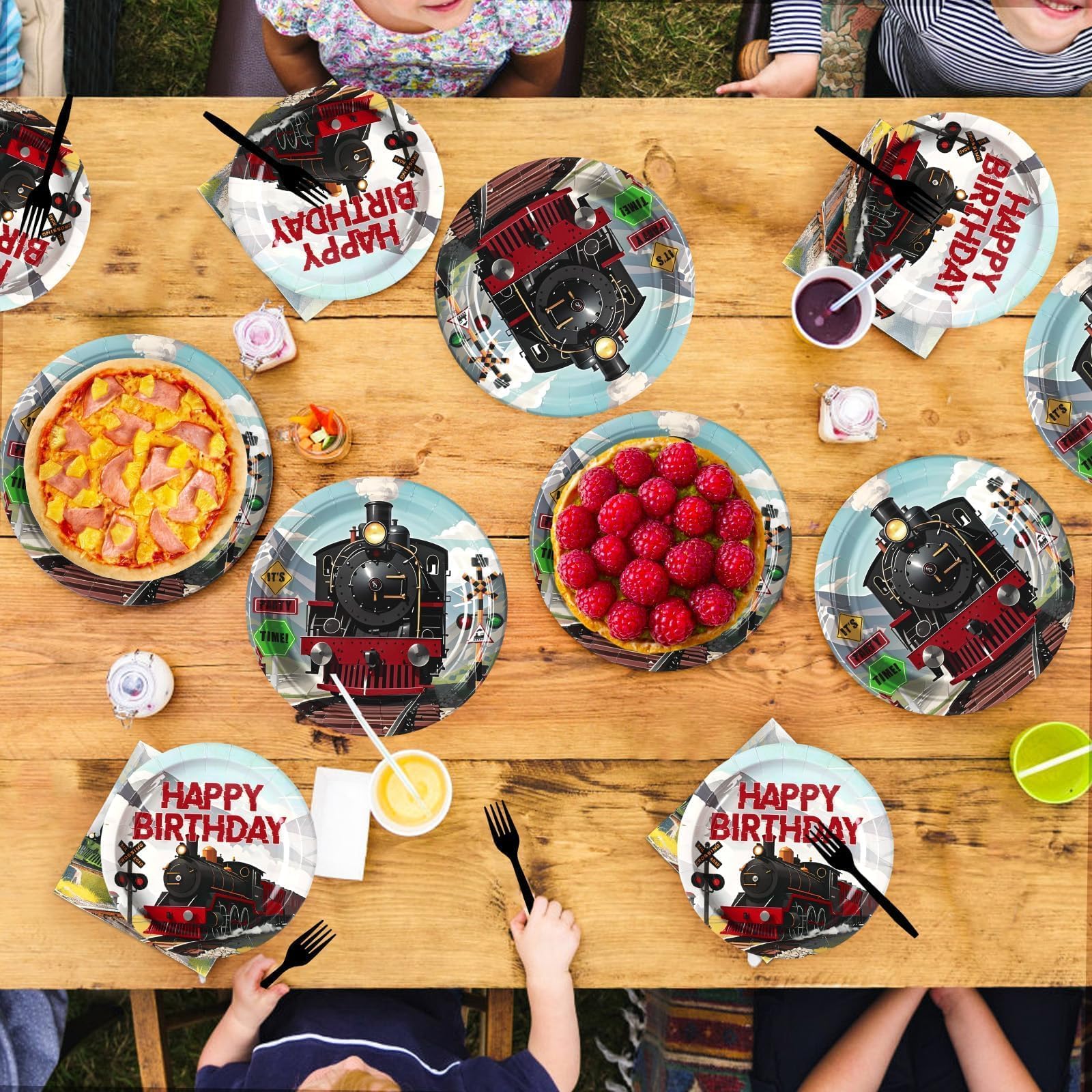 Steam Train Theme Design: This party supplies set pays homage to classic steam trains. The 9 - inch and 7 - inch round plates feature high - def, vivid steam train images against scenic railway backdrops, with “HAPPY BIRTHDAY” artfully printed for a festive touch. Ideal for both small family gatherings and big birthday parties, it swiftly immerses guests in a nostalgic railway adventure