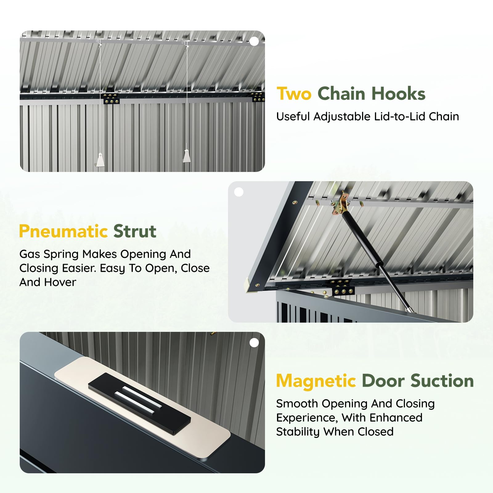 Lift-Up Lid with Gas Spring for Easy Disposal Built-in pneumatic strut ensures smooth and effortless opening and closing. Adjustable lid chains connect to your trash bin lids, allowing the top to lift simultaneously for convenient waste disposal.