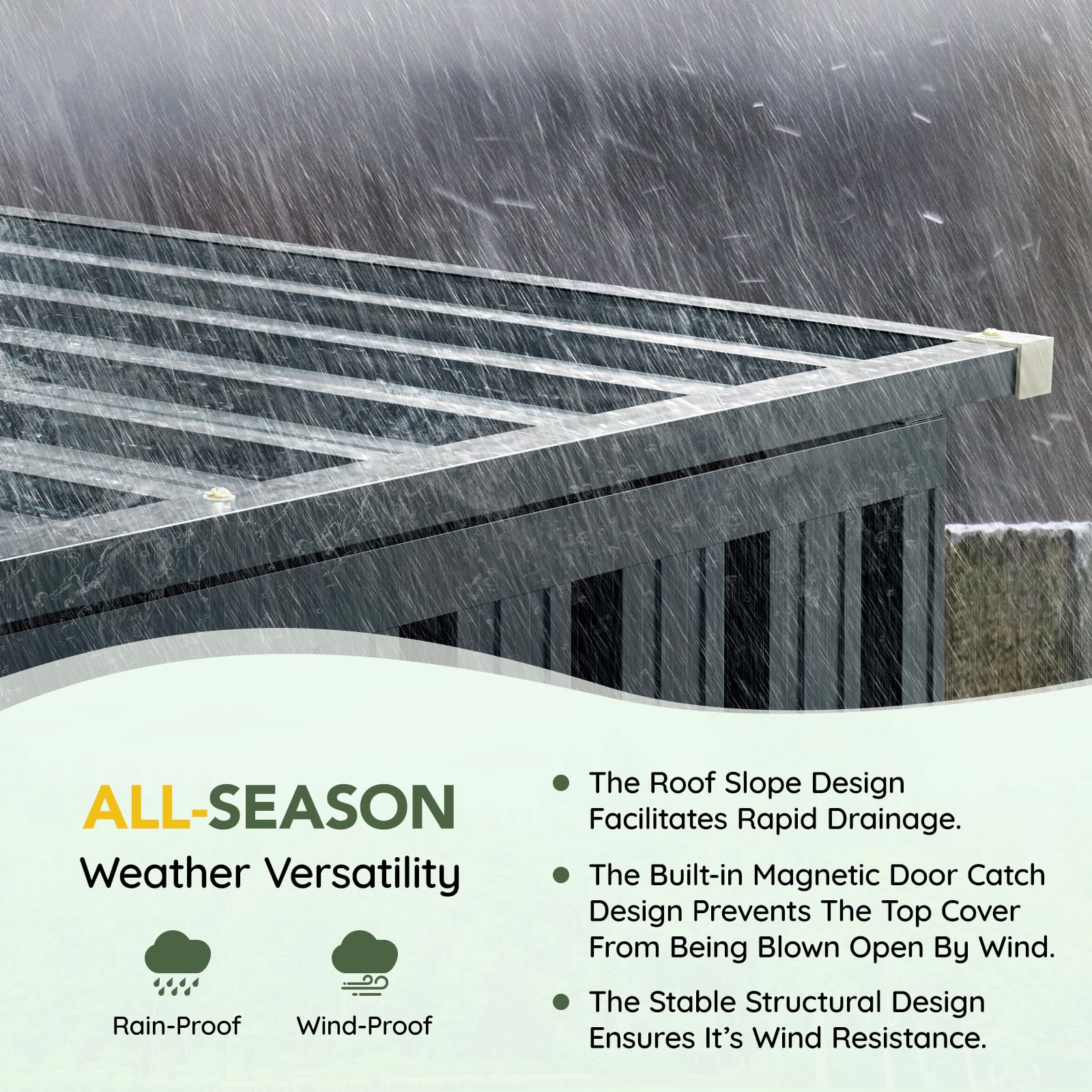 Sloped Roof for All-Weather Protection The slanted roof design prevents rainwater and snow from accumulating, reducing pressure on the structure. Provides reliable protection against UV exposure, heavy rain, and winter snow to keep bins dry and clean.