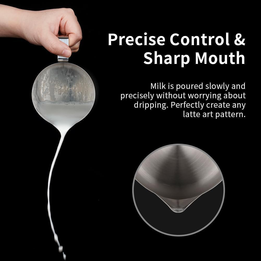 DRIPLESS SPOUT DESIGN: The dripless spout allows you pour milk foam smoothly and precisely without dripping. You can practice and create your own beautiful latte artwork easily!