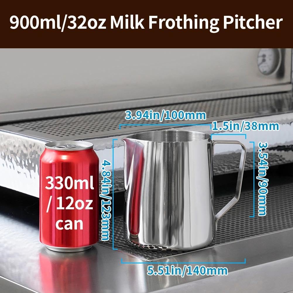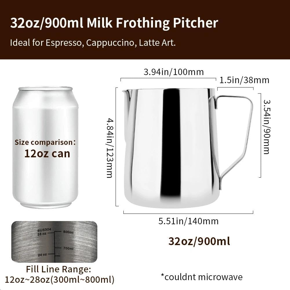 INSIDE SCALE LINES MEASURING: The milk pitcher has clear inside measurement lines(ml/oz), making it easier to control the amount of milk or cream per cup of coffee. 31oz milk frother pitcher can satisfied your different demands. Ideal for foaming or steaming milk, used in espresso and cappuccinos, it can be used for any liquid measuring like water, juices, batter mixes, smoothies etc.