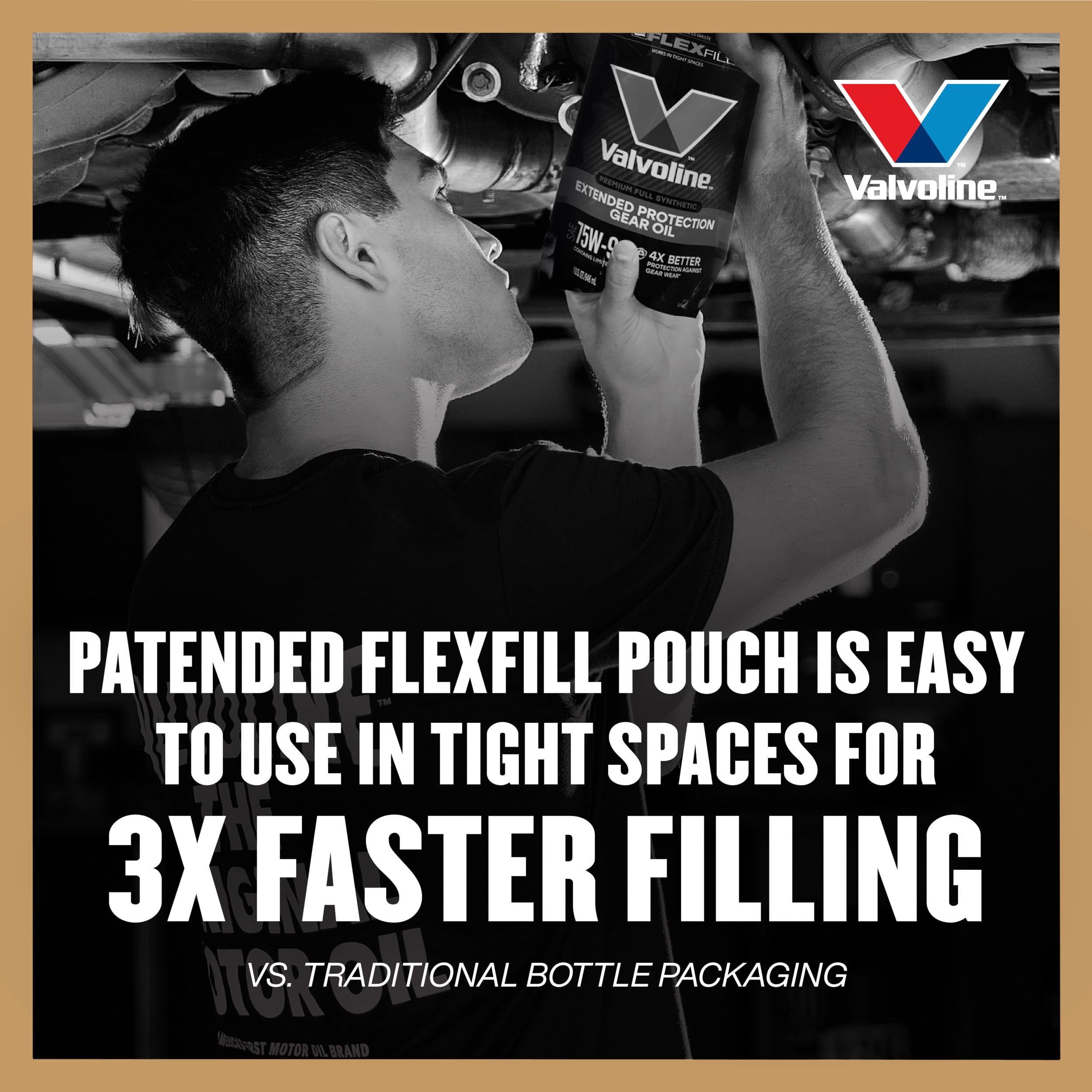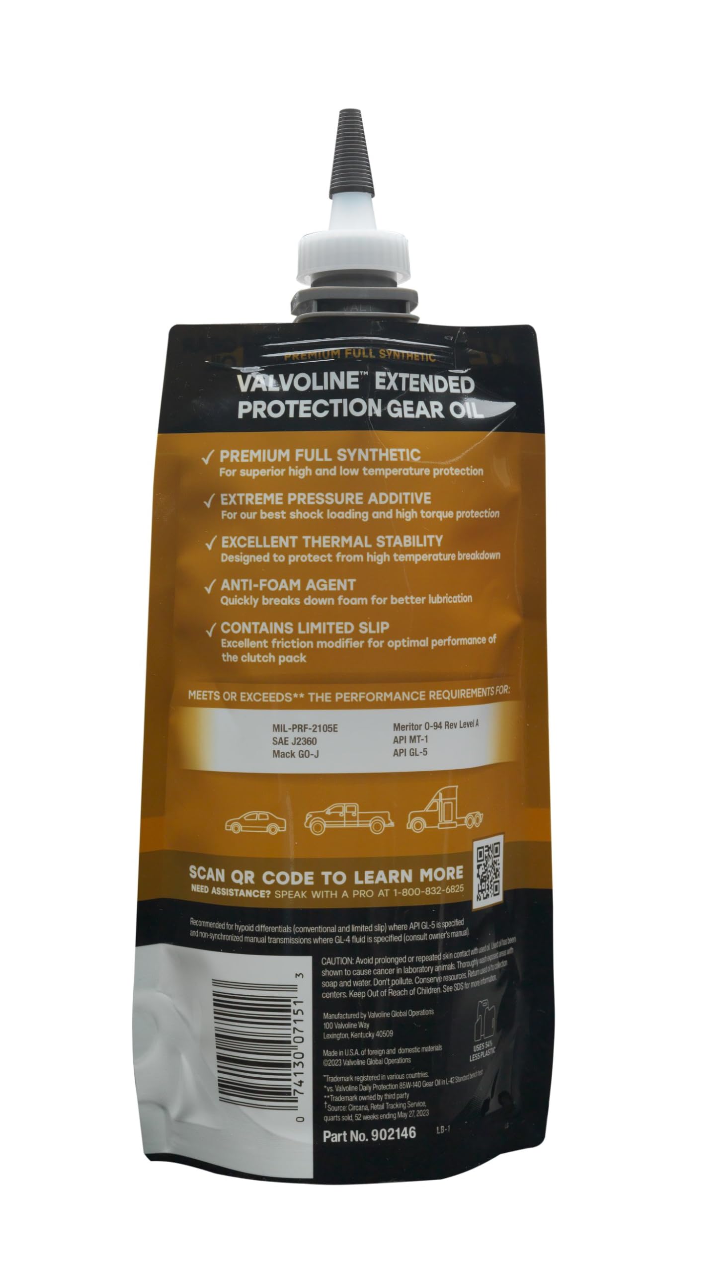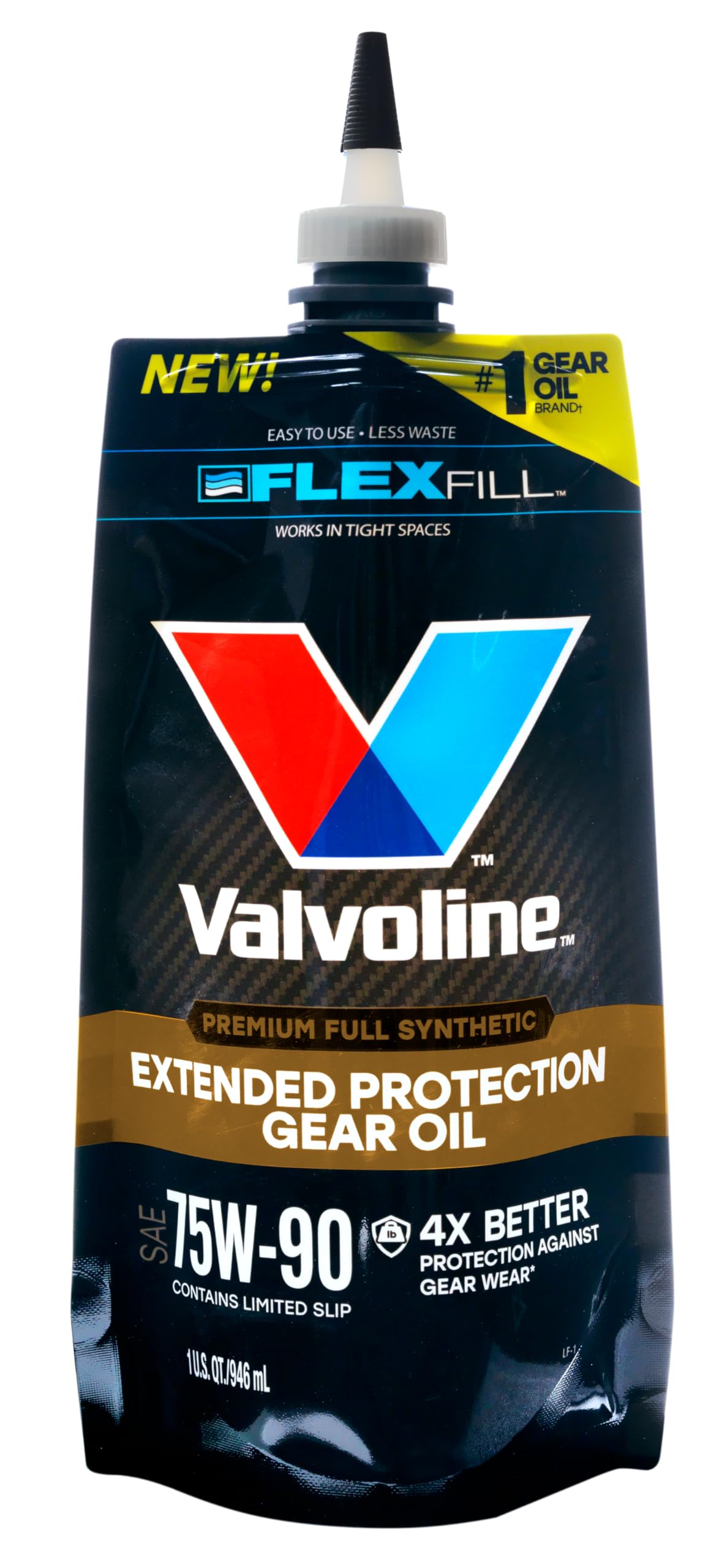 Extended Protection Full Synthetic 75W-90 Gear Oil is Valvoline’s best performing passenger car gear oil. Combining unique FlexFill packaging with superior product engineering, Extended Protection delivers 4X better gear wear protection, 4X better extreme pressure protection and 60% better protection against towing and heavy loads vs. Valvoline Daily Protection 75W-90 in ASTM D-7452. So no matter where the road leads, Valvoline Extended Protection Gear Oil is proven to protect gears from wearing out prematurely. Innovative additive technology provides cold temperature fluidity, extreme pressure protection, improved load carrying capacity and high-temperature performance in demanding environments like heavy hauling, towing or off-roading. Add to that excellent oxidation resistance plus limited slip for optimal clutch pack performance and you have the ultimate protection. DIYers asked for a premium gear oil in an easy-to-use package. Valvoline answered with Extended Protection Full Synthetic 75W-90, from the #1 gear oil brand.