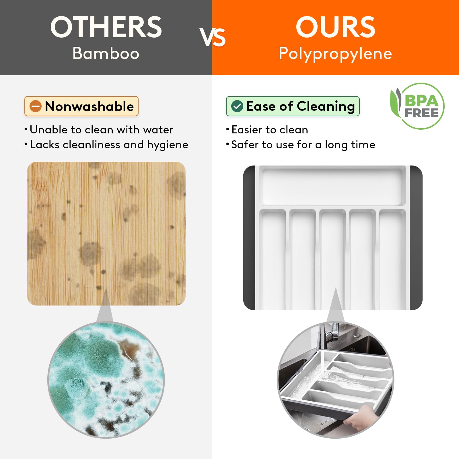 Robust and Safe: This kitchen drawer organizer is crafted from premium PP material, BPA-free and built to last. It ensures your silverware is stored in a healthy, safe environment for worry-free use